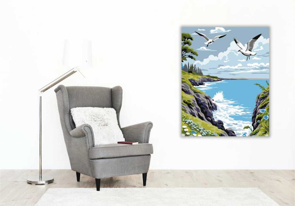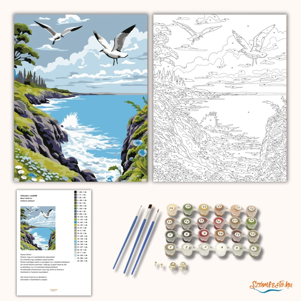 A képen egy tengerparti sziklapart látható, ahol a hullámok fehér habja a partnak csapódik. A sziklák tetején zöld növényzet és apró virágok nyílnak, a magasban pedig két sirály repül a felhős ég alatt. Nyugodt, üdítő hangulatú látvány, amely a tengerparti séták érzését idézi. Varázsolj egyedi hangulatot otthonodba ezzel a gyönyörű számfestő készlettel, amely tökéletes ajándék is lehet szeretteid számára. A csomag mindent tartalmaz, amire szükséged van ahhoz, hogy saját kezűleg alkoss egy lenyűgöző festményt.