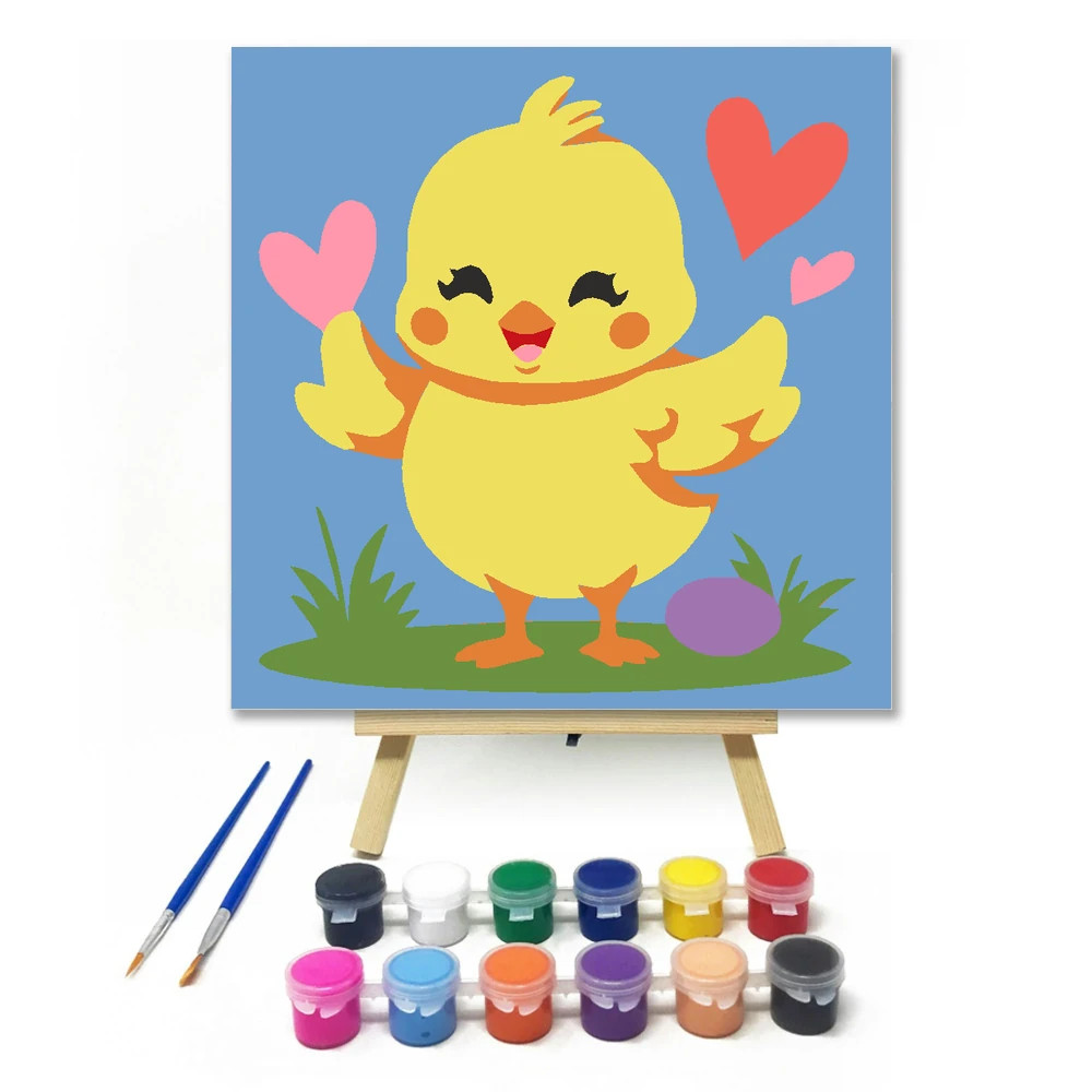 Ezen a képen egy mosolygós kiscsibe tárja szét a szárnyait, körülötte szívecskék repkednek. A sárga csibe mellett zöld fű és egy lila húsvéti tojás is látható. A domináns színek a sárga, a kék, a zöld és a rózsaszín. Díszítsd otthonodat saját kézzel készített műalkotással, vagy ajándékozd meg szeretteidet egy igazán különleges élménnyel! A számfestő készletben minden szükséges eszköz megtalálható a festmény elkészítéséhez.
