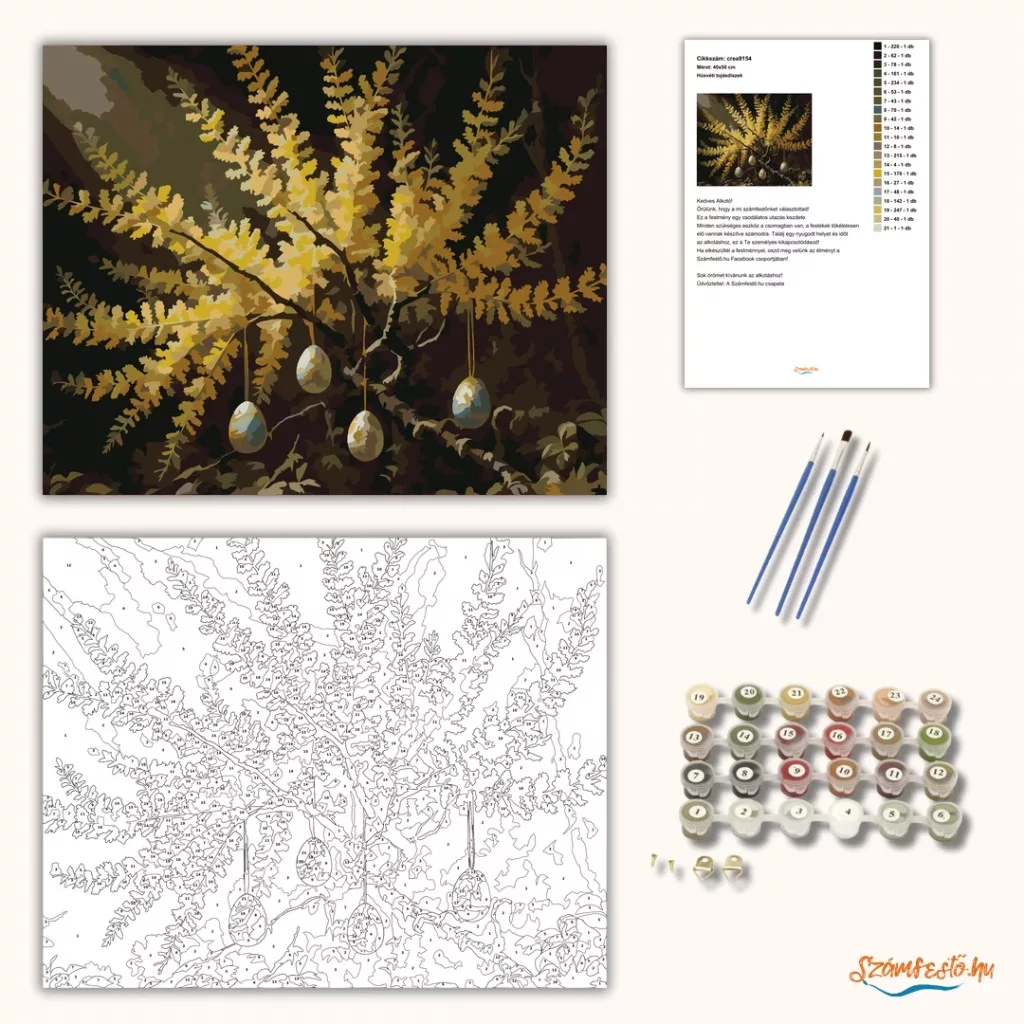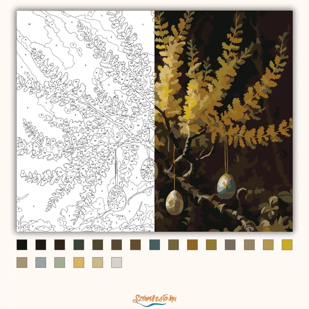 A képen egy lombos fa ágai láthatók, aranyló levelekkel és négy, zsinóron lógó tojásdísszel. A sötét háttér kiemeli a világos leveleket, így a látvány meleg és meghitt. Tavaszi, ünnepi hangulatú kép, amely jól mutat nappaliban vagy előszobában is. Varázsolj egyedi hangulatot otthonodba ezzel a gyönyörű számfestő készlettel, amely tökéletes ajándék is lehet szeretteid számára. A csomag mindent tartalmaz, amire szükséged van ahhoz, hogy saját kezűleg alkoss egy lenyűgöző festményt.