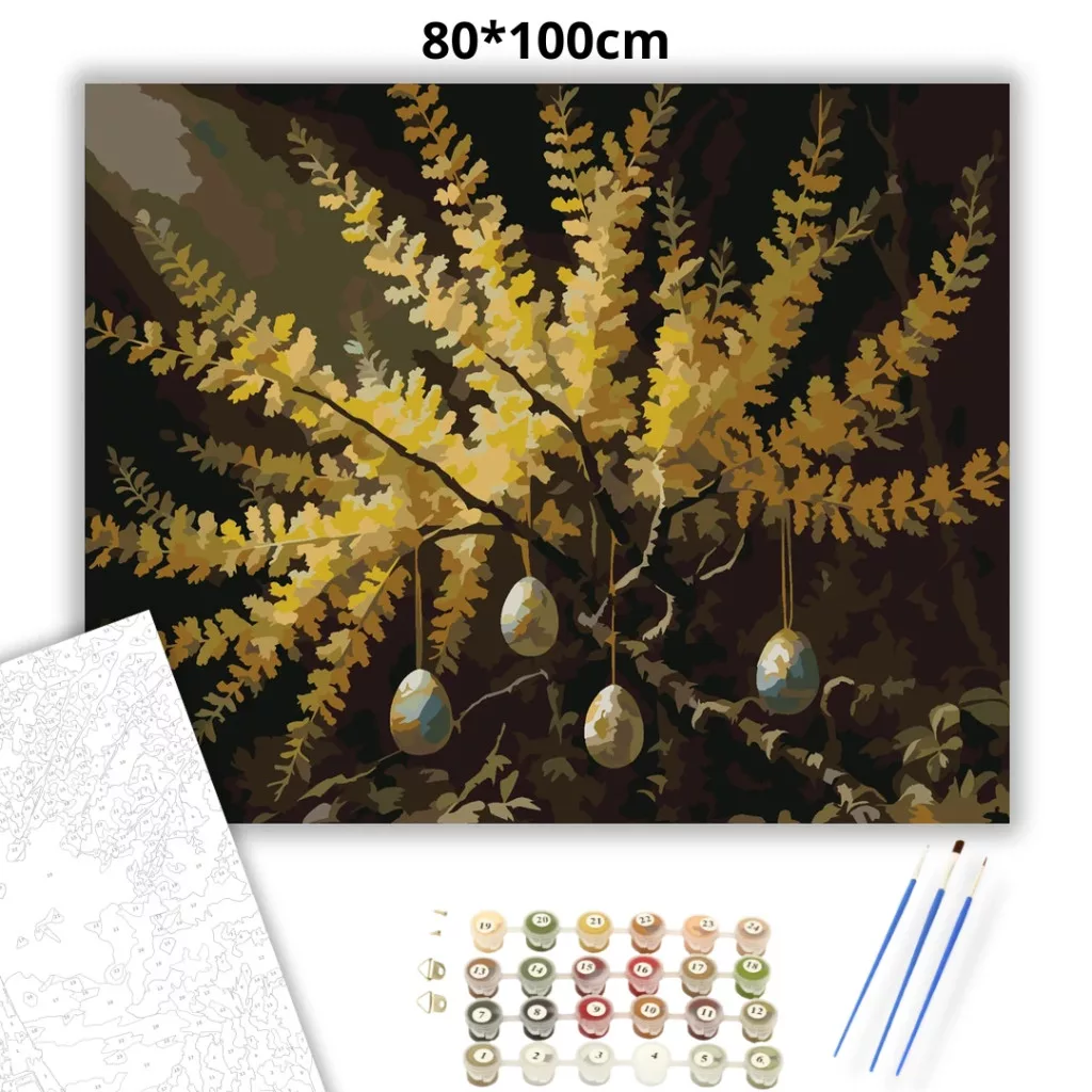 A képen egy lombos fa ágai láthatók, aranyló levelekkel és négy, zsinóron lógó tojásdísszel. A sötét háttér kiemeli a világos leveleket, így a látvány meleg és meghitt. Tavaszi, ünnepi hangulatú kép, amely jól mutat nappaliban vagy előszobában is. Varázsolj egyedi hangulatot otthonodba ezzel a gyönyörű számfestő készlettel, amely tökéletes ajándék is lehet szeretteid számára. A csomag mindent tartalmaz, amire szükséged van ahhoz, hogy saját kezűleg alkoss egy lenyűgöző festményt.