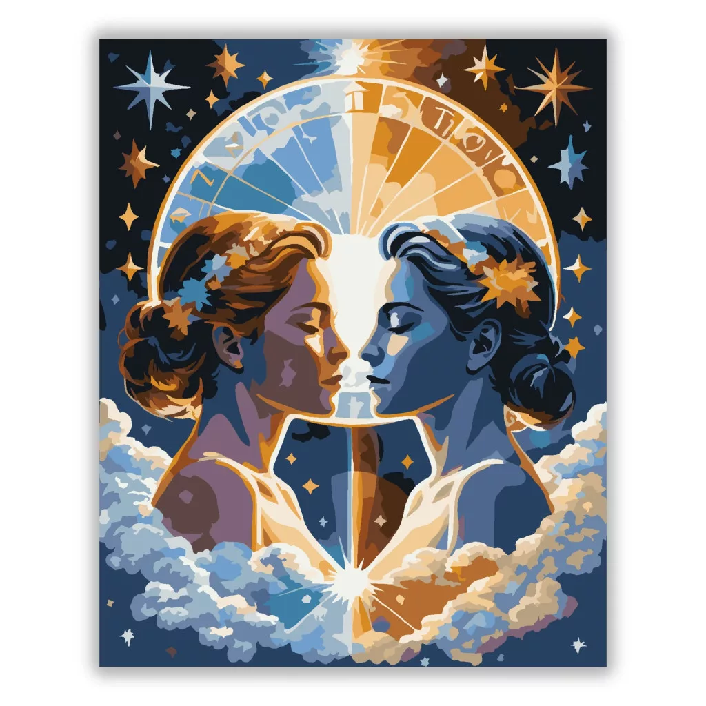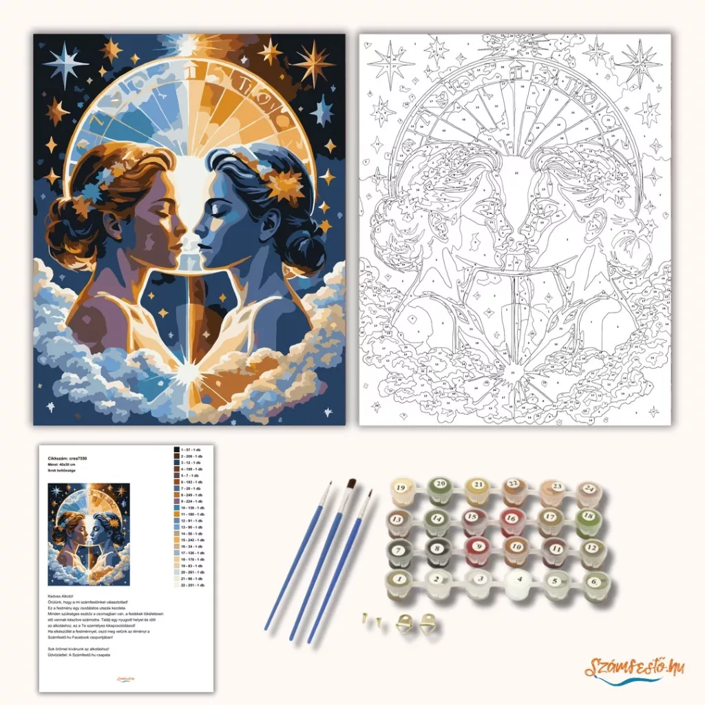 A képen az Ikrek kettőssége jelenik meg: két női arc néz egymás felé, egyikük napfényes, a másik holdfényes hangulatban. A háttérben csillagok, felhők és egy zodiákus kör látható, amely összeköti a nappalt és az éjszakát. A kép egyszerre álomszerű és misztikus, meleg arany és hűvös kék tónusokkal. Díszítsd otthonodat saját kézzel készített műalkotással, vagy ajándékozd meg szeretteidet egy igazán különleges élménnyel! A számfestő készletben minden szükséges eszköz megtalálható a festmény elkészítéséhez.