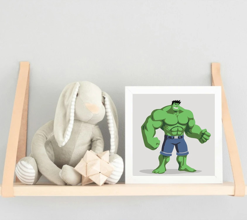 A képen egy zöld, szupererős óriás hős áll magabiztosan, hatalmas izmokkal és ökölbe szorított kézzel. A zöld árnyalatok dominálnak, amit a kék rövidnadrág és a sötét haj tesz még látványosabbá. Izgalmas választás a szuperhősöket kedvelő kis művészeknek!