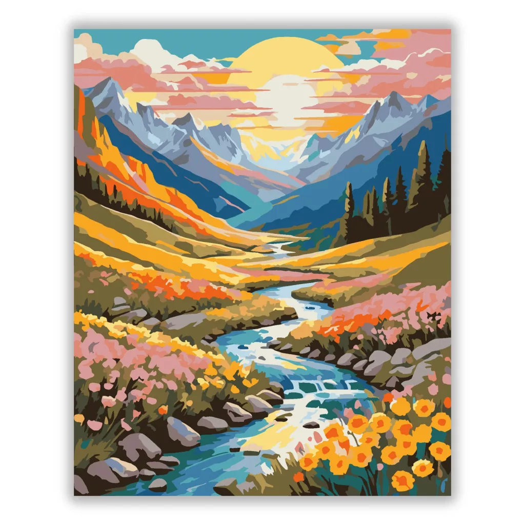 A képen egy hegyekkel körülölelt völgy látható, ahol egy kanyargó patak fut végig a tájon. A nap alacsonyan áll az égen, felhők között, meleg fényt adva a hegyoldalaknak. Az előtérben virágos rét és kövek szegélyezik a vízpartot, nyugodt, természetközeli hangulattal. Varázsolj egyedi hangulatot otthonodba ezzel a gyönyörű számfestő készlettel, amely tökéletes ajándék is lehet szeretteid számára. A csomag mindent tartalmaz, amire szükséged van ahhoz, hogy saját kezűleg alkoss egy lenyűgöző festményt.