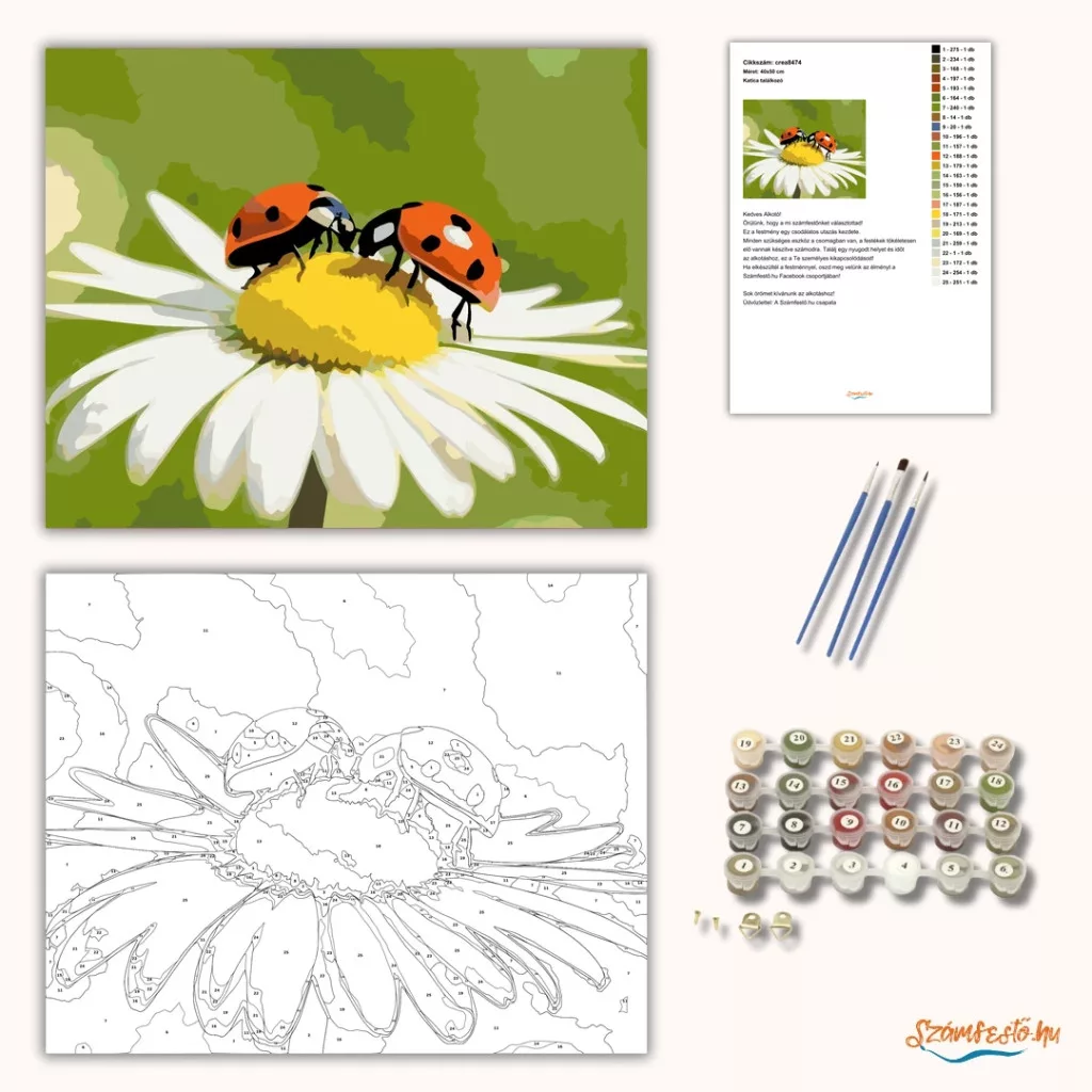 A képen két katicabogár látható, ahogy egy margaréta sárga közepén találkoznak. A fehér szirmok és a puha, zöld háttér friss, tavaszi hangulatot adnak. Kedves, természetközeli jelenet, ami jól mutat bármelyik szobában. Engedd szabadjára a kreativitásodat, és alkoss egy különleges műalkotást, amely otthonod dísze lehet de egyedi ajándékként is kiváló. A számfestő készletben minden szükséges eszközt megtalálsz a tökéletes végeredményhez.