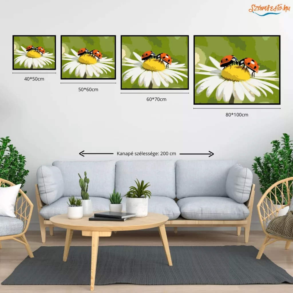 A képen két katicabogár látható, ahogy egy margaréta sárga közepén találkoznak. A fehér szirmok és a puha, zöld háttér friss, tavaszi hangulatot adnak. Kedves, természetközeli jelenet, ami jól mutat bármelyik szobában. Legyen a lakásod dísze vagy egy kedves meglepetés valaki számára – ez a számfestő készlet tökéletes választás mindkettőre. A készletben mindent megtalálsz, amivel lépésről lépésre megalkotható ez a gyönyörű festmény.