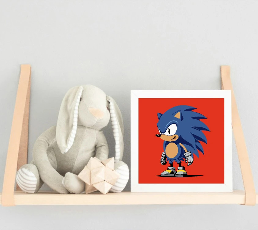 A képen egy kék, tüskés hátú sünis figura áll magabiztosan, fehér kesztyűben és sportcipőben. A kék és bézs színek dominálnak, a háttér pedig élénk piros. Szuper választás, ha a gyerekek szeretik a pörgős, rajzfilmes hősöket!