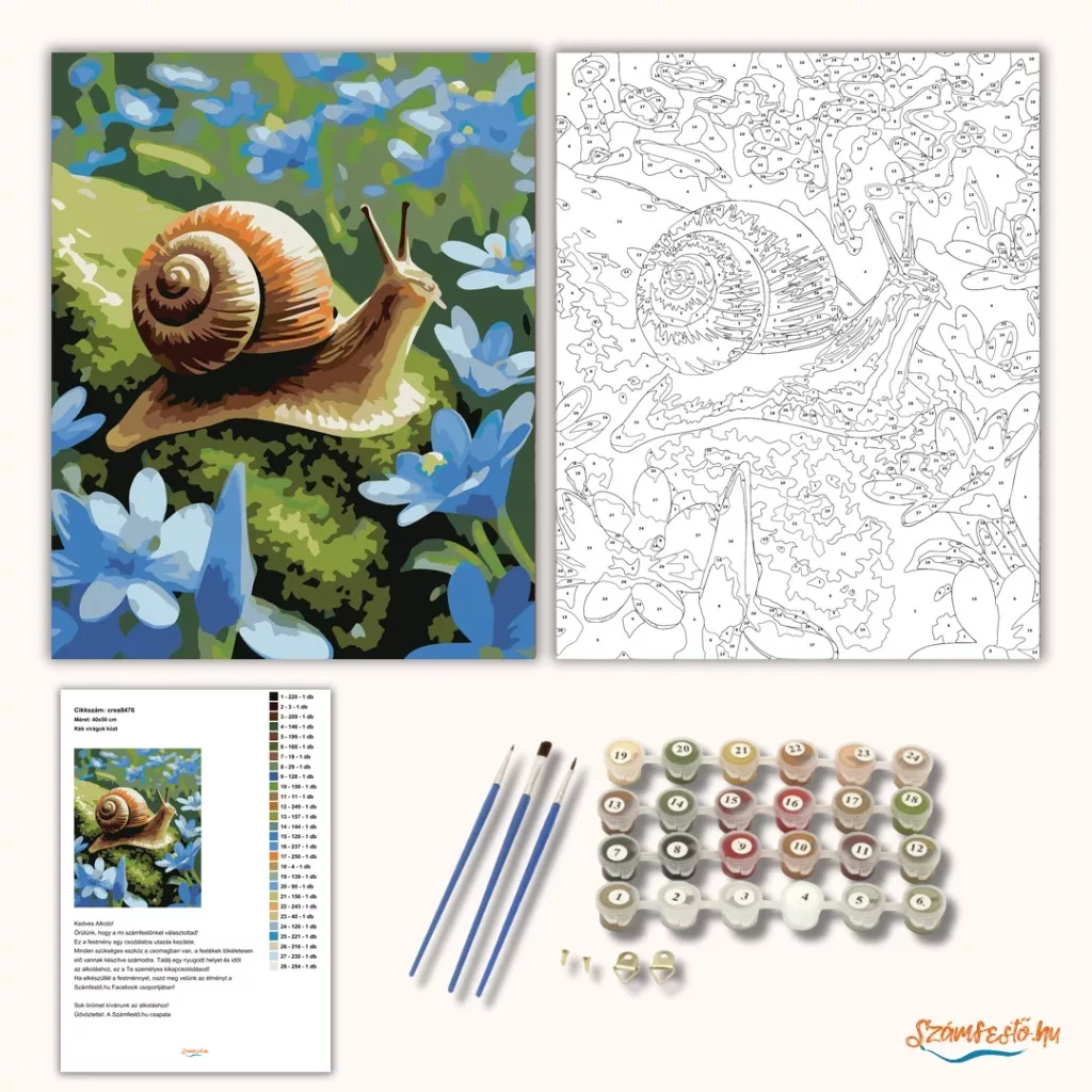 A képen egy csiga látható közelről, ahogy mohás talajon halad, körülötte apró kék virágokkal. A jelenet friss, tavaszi hangulatot áraszt, nyugodt, természetközeli részletekkel. A zöld lombok és a csiga csigaházának meleg árnyalatai szépen kiemelik a virágokat. Varázsolj egyedi hangulatot otthonodba ezzel a gyönyörű számfestő készlettel, amely tökéletes ajándék is lehet szeretteid számára. A csomag mindent tartalmaz, amire szükséged van ahhoz, hogy saját kezűleg alkoss egy lenyűgöző festményt.