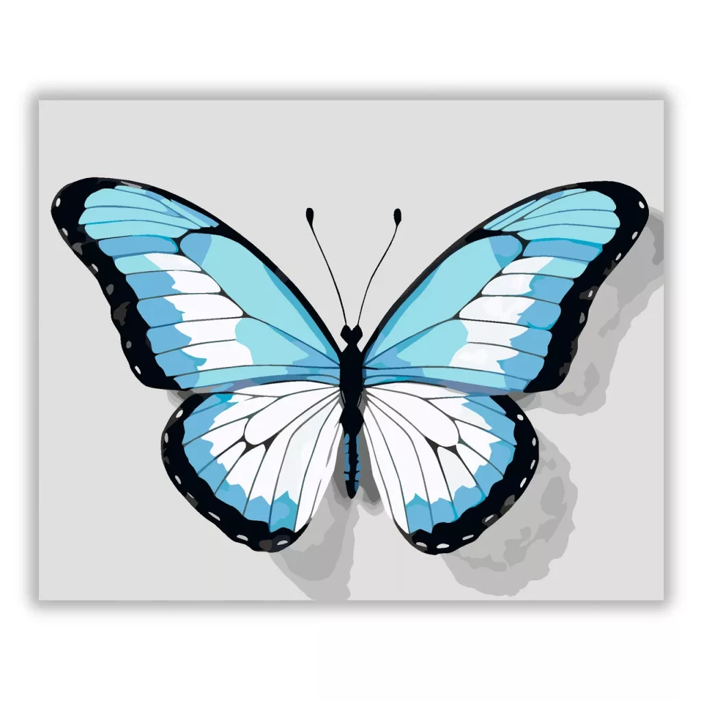 A képen egy kék pillangó látható kiterjesztett szárnyakkal, erős fekete szegéllyel és tagolt mintázattal. A világos háttéren finom árnyék emeli ki a formáját. Friss, könnyed hangulatú kép, amely jól mutat modern és letisztult terekben is. Varázsolj egyedi hangulatot otthonodba ezzel a gyönyörű számfestő készlettel, amely tökéletes ajándék is lehet szeretteid számára. A csomag mindent tartalmaz, amire szükséged van ahhoz, hogy saját kezűleg alkoss egy lenyűgöző festményt.