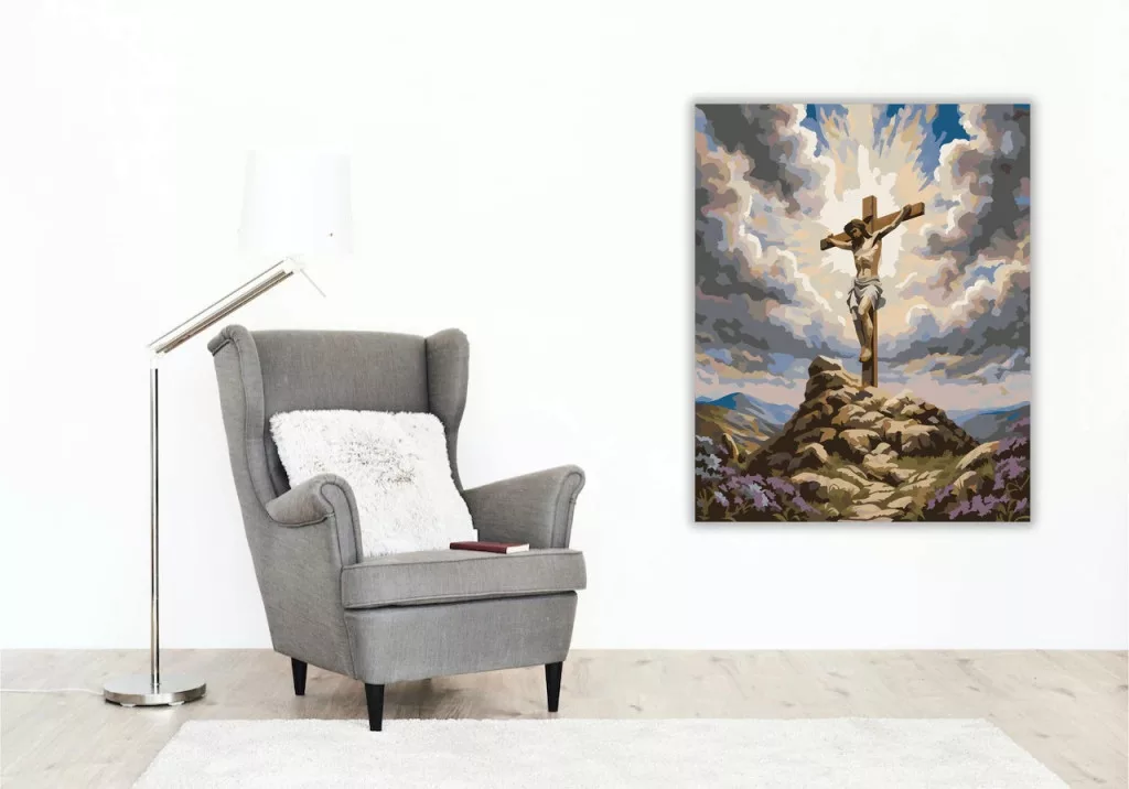A képen a keresztre feszített Jézus látható egy sziklás dombon, fölötte drámai, felhős égbolttal. A háttérben hegyek és völgyek rajzolódnak ki, elöl vadvirágok és kövek között vezet a tekintet. A világos fények és a sötétebb felhők ünnepélyes, elmélyült hangulatot adnak a jelenetnek. Varázsolj egyedi hangulatot otthonodba ezzel a gyönyörű számfestő készlettel, amely tökéletes ajándék is lehet szeretteid számára. A csomag mindent tartalmaz, amire szükséged van ahhoz, hogy saját kezűleg alkoss egy lenyűgöző festményt.