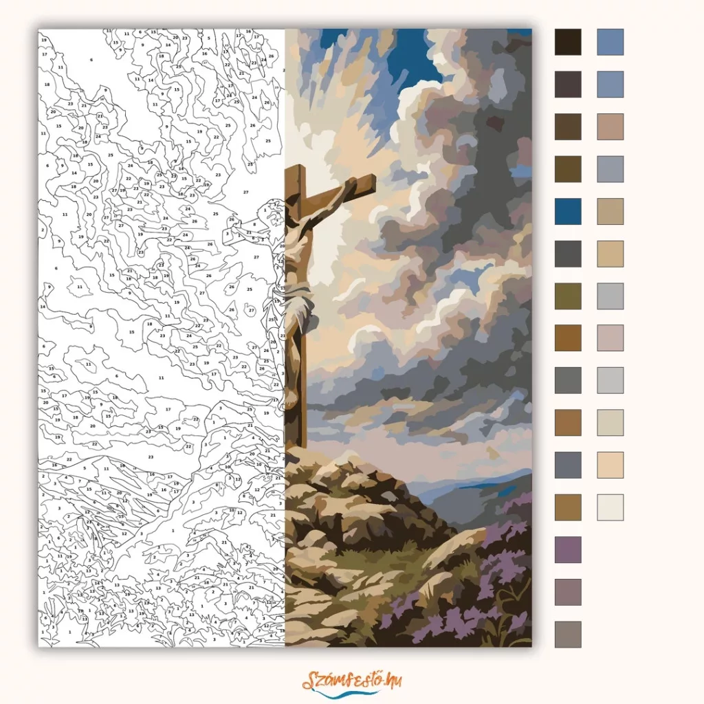 A képen a keresztre feszített Jézus látható egy sziklás dombon, fölötte drámai, felhős égbolttal. A háttérben hegyek és völgyek rajzolódnak ki, elöl vadvirágok és kövek között vezet a tekintet. A világos fények és a sötétebb felhők ünnepélyes, elmélyült hangulatot adnak a jelenetnek. Ez a számfestő készlet tökéletes választás, ha egyedi dekorációval tennéd szebbé otthonodat, vagy ha különleges ajándékot keresel. A csomagban minden megtalálható, amire a festéshez szükséged van.