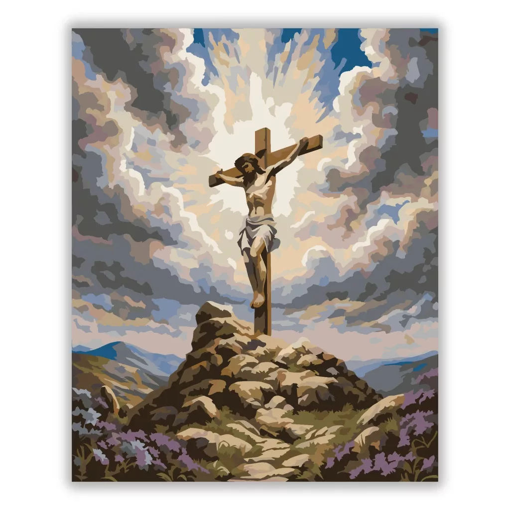 A képen a keresztre feszített Jézus látható egy sziklás dombon, fölötte drámai, felhős égbolttal. A háttérben hegyek és völgyek rajzolódnak ki, elöl vadvirágok és kövek között vezet a tekintet. A világos fények és a sötétebb felhők ünnepélyes, elmélyült hangulatot adnak a jelenetnek. Díszítsd otthonodat saját kézzel készített műalkotással, vagy ajándékozd meg szeretteidet egy igazán különleges élménnyel! A számfestő készletben minden szükséges eszköz megtalálható a festmény elkészítéséhez.