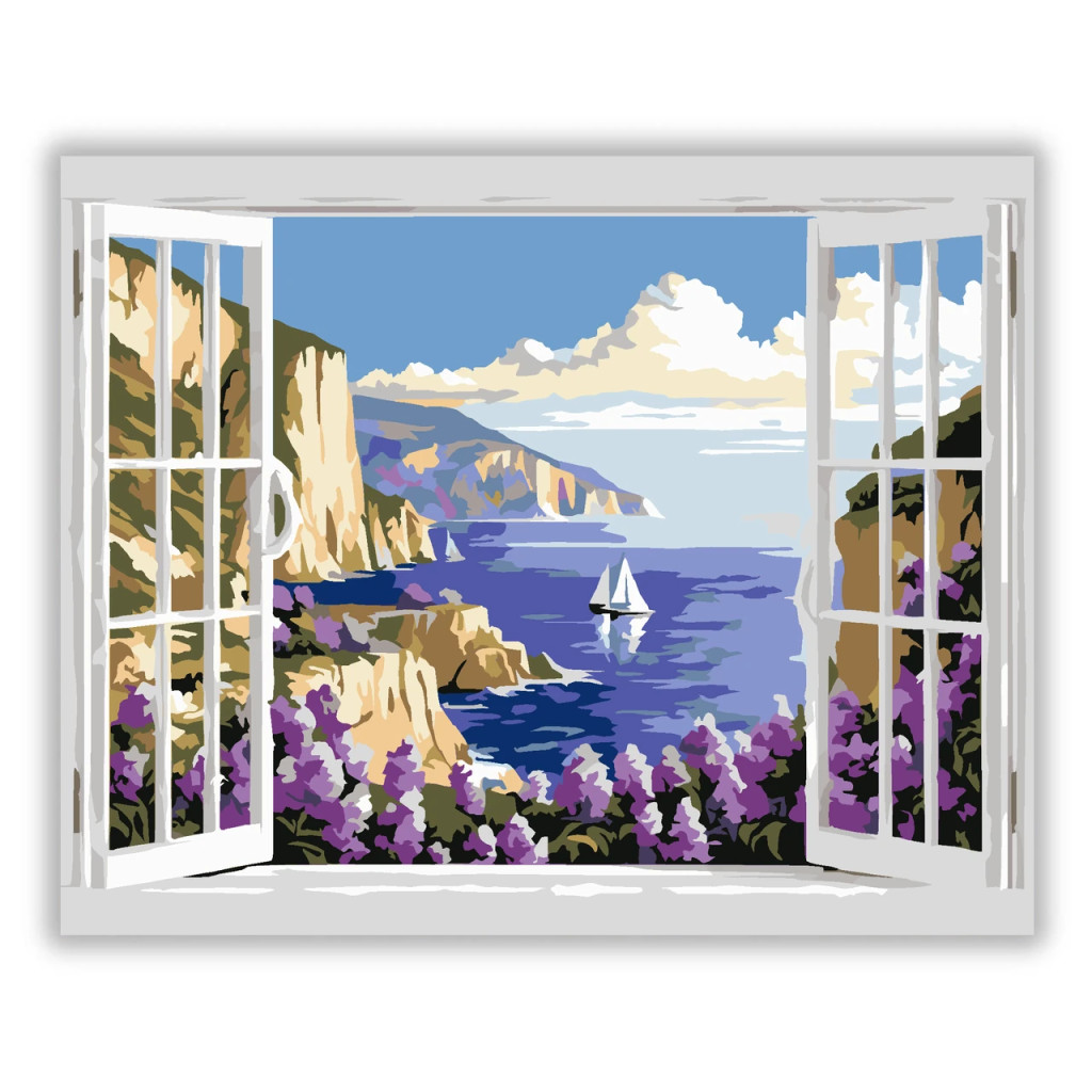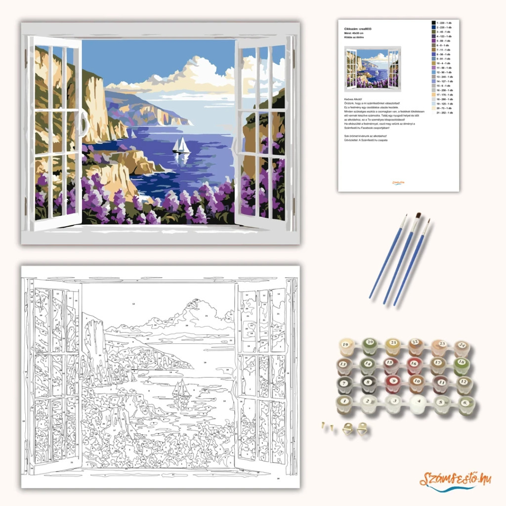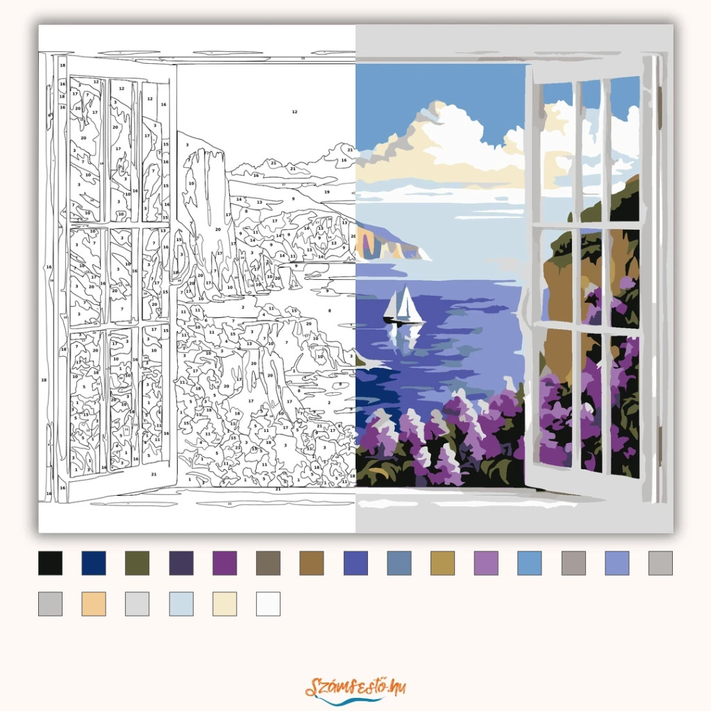 A képen egy nyitott ablakon át tengeröböl látható sziklás parttal és távoli hegyekkel. A vízen egy vitorlás úszik, felette nagy, világos felhők vannak az égen. Az ablak előtt lila virágok keretezik a látványt, nyugodt, nyári hangulatot adva. Legyen a lakásod dísze vagy egy kedves meglepetés valaki számára – ez a számfestő készlet tökéletes választás mindkettőre. A készletben mindent megtalálsz, amivel lépésről lépésre megalkotható ez a gyönyörű festmény.