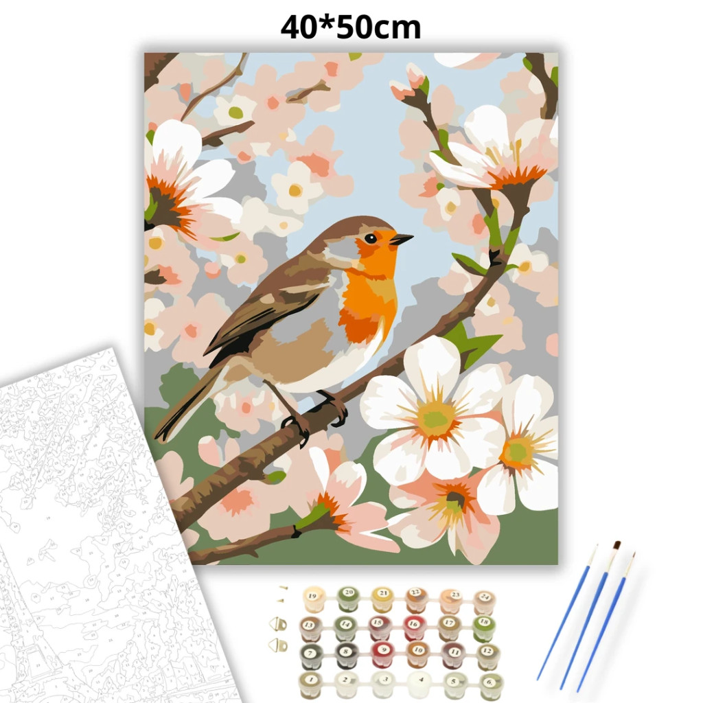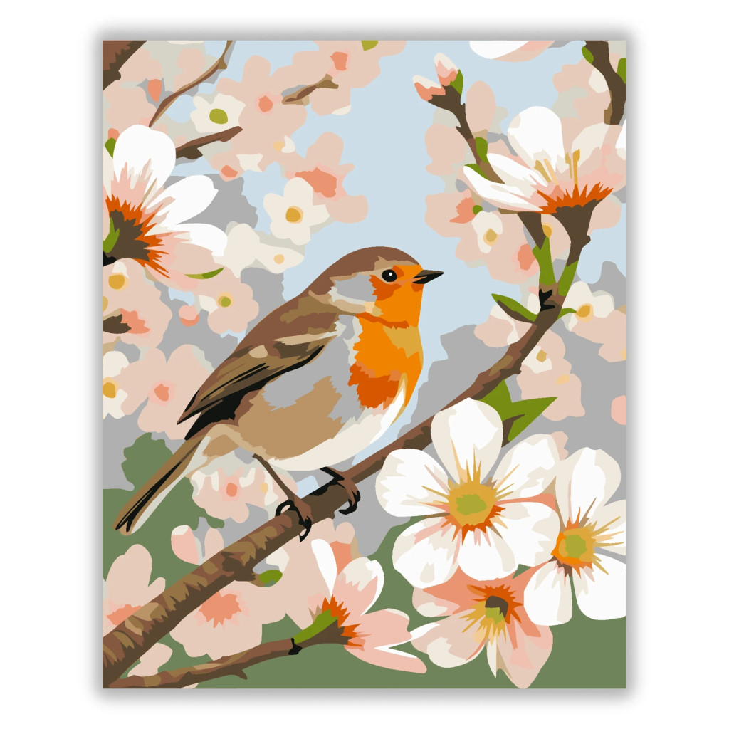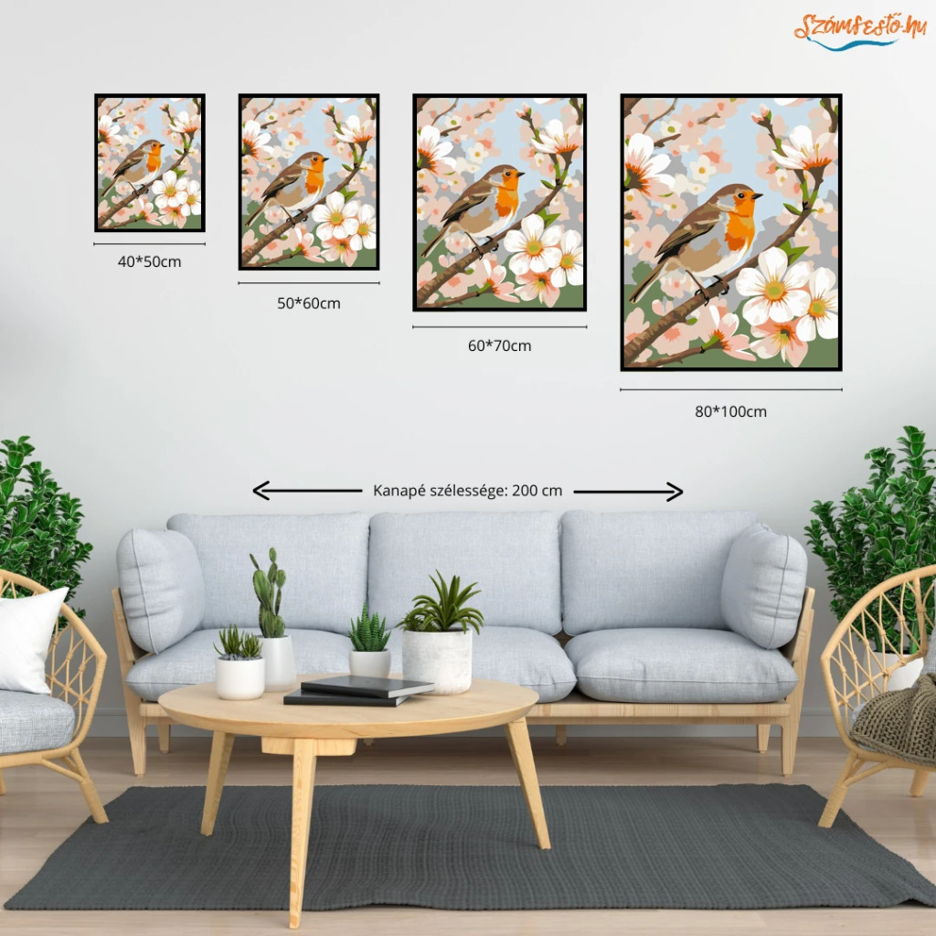 A képen egy vörösbegy ül egy virágzó ágon, körülötte finom, pasztelles szirmokkal. A fehér virágok és a lágy égbolt nyugodt, tavaszias hangulatot adnak. Kedves, természetközeli látvány, ami frissességet visz a falra. Díszítsd otthonodat saját kézzel készített műalkotással, vagy ajándékozd meg szeretteidet egy igazán különleges élménnyel! A számfestő készletben minden szükséges eszköz megtalálható a festmény elkészítéséhez.