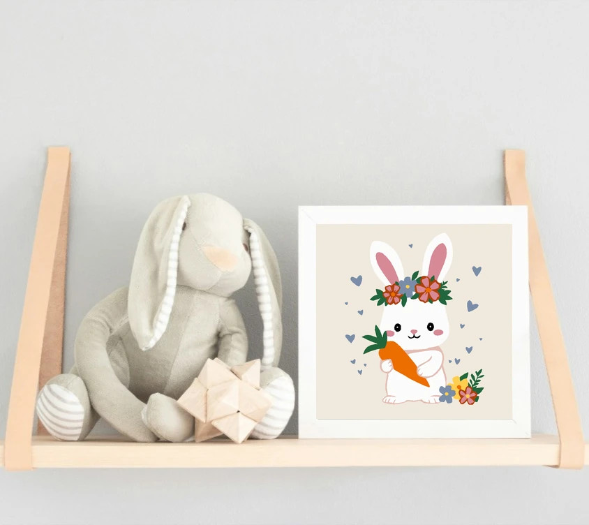Ezen a képen egy kedves fehér nyuszi látható, aki egy nagy narancssárga répát ölel. A fején virágkoszorú van, körülötte apró szívecskék lebegnek. A fehér, rózsaszín, narancssárga és zöld színek vidáman dominálnak. Ez a számfestő készlet tökéletes választás, ha egyedi dekorációval tennéd szebbé otthonodat, vagy ha különleges ajándékot keresel. A csomagban minden megtalálható, amire a festéshez szükséged van.