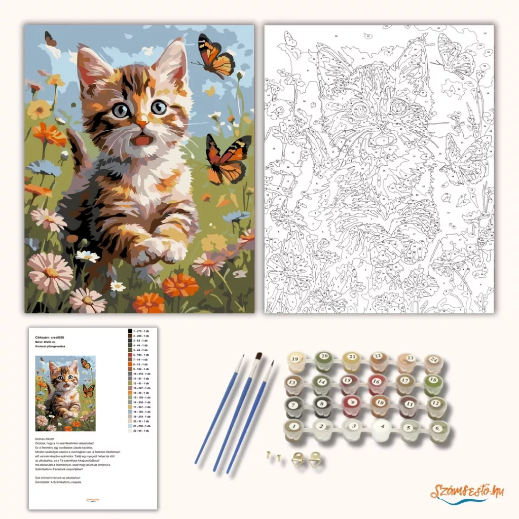 A képen egy cica látható egy virágos mezőben, nagy szemekkel előre nézve. Két pillangó repül körülötte, a háttérben pedig ég és felhők látszanak. Vidám, könnyed hangulatú jelenet sok apró virággal. Ez a számfestő készlet tökéletes választás, ha egyedi dekorációval tennéd szebbé otthonodat, vagy ha különleges ajándékot keresel. A csomagban minden megtalálható, amire a festéshez szükséged van.