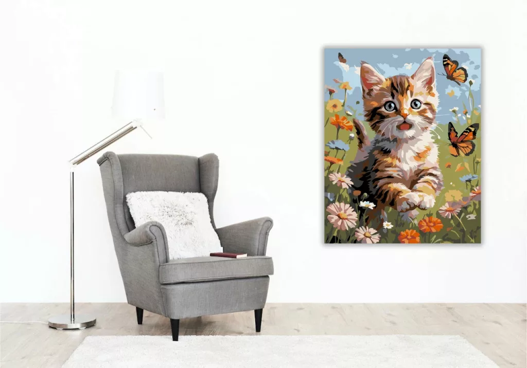 A képen egy cica látható egy virágos mezőben, nagy szemekkel előre nézve. Két pillangó repül körülötte, a háttérben pedig ég és felhők látszanak. Vidám, könnyed hangulatú jelenet sok apró virággal. Engedd szabadjára a kreativitásodat, és alkoss egy különleges műalkotást, amely otthonod dísze lehet de egyedi ajándékként is kiváló. A számfestő készletben minden szükséges eszközt megtalálsz a tökéletes végeredményhez.