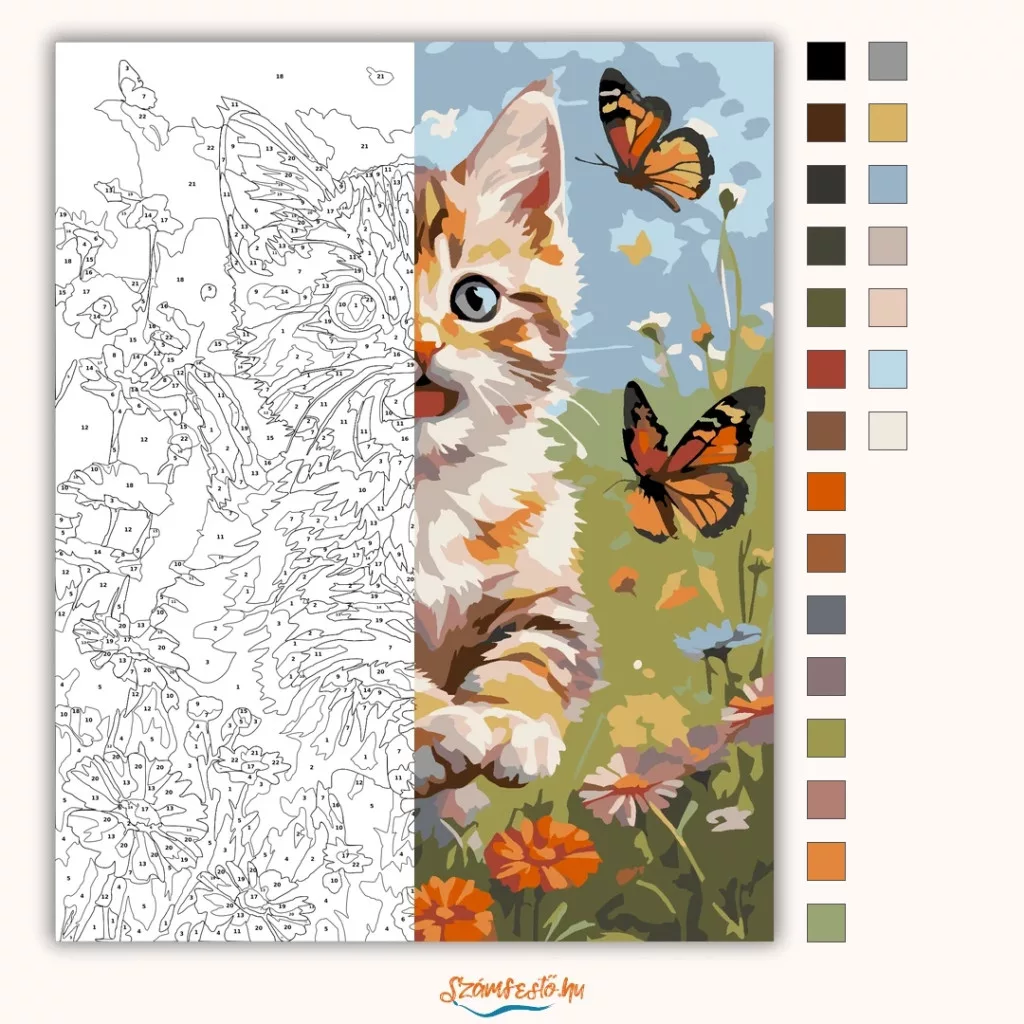 A képen egy cica látható egy virágos mezőben, nagy szemekkel előre nézve. Két pillangó repül körülötte, a háttérben pedig ég és felhők látszanak. Vidám, könnyed hangulatú jelenet sok apró virággal. Legyen a lakásod dísze vagy egy kedves meglepetés valaki számára – ez a számfestő készlet tökéletes választás mindkettőre. A készletben mindent megtalálsz, amivel lépésről lépésre megalkotható ez a gyönyörű festmény.