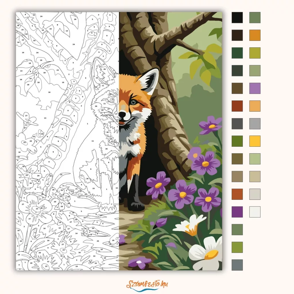 A képen egy rókakölyök ül egy nagy fa odvában, körülötte tavaszi virágok nyílnak. A jelenet barátságos és mesés hangulatú, a róka kíváncsi tekintete azonnal magára vonja a figyelmet. A zöld háttér és a lila-fehér virágok friss, üde összhatást adnak. Varázsolj egyedi hangulatot otthonodba ezzel a gyönyörű számfestő készlettel, amely tökéletes ajándék is lehet szeretteid számára. A csomag mindent tartalmaz, amire szükséged van ahhoz, hogy saját kezűleg alkoss egy lenyűgöző festményt.