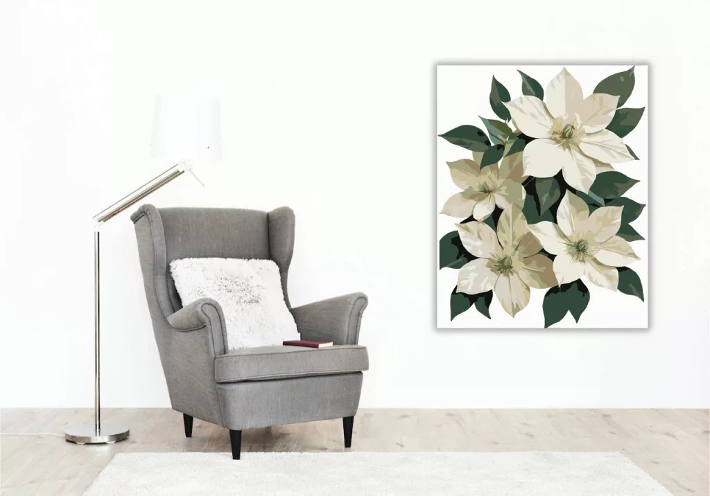 A képen krémszínű klemátisz virágok láthatók sötétzöld levelekkel, fehér háttér előtt. A nagy, 5–6 szirmú virágok légies, friss összhatást adnak. Nyugodt, elegáns hangulatú kép, ami szépen mutat bármelyik helyiségben. Díszítsd otthonodat saját kézzel készített műalkotással, vagy ajándékozd meg szeretteidet egy igazán különleges élménnyel! A számfestő készletben minden szükséges eszköz megtalálható a festmény elkészítéséhez.