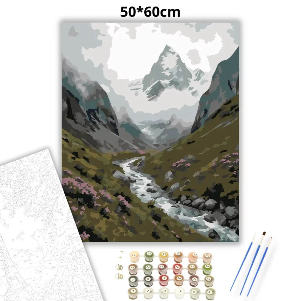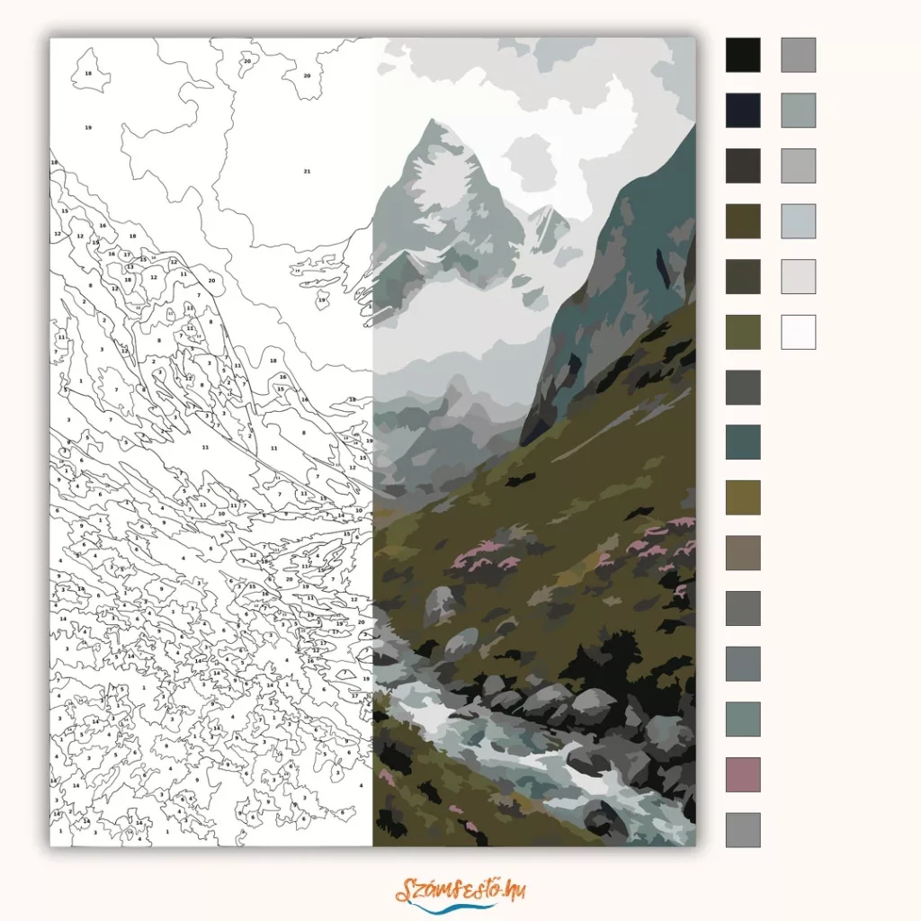 A képen egy hegyvidéki völgy látható, középen kanyargó patakkal és kövekkel szegélyezett mederrel. A távolban meredek hegycsúcs emelkedik, körülötte sűrű köd és felhők ülnek. Az előtérben hegyi rét és apró virágfoltok teszik barátságossá a hűvös, nyugodt tájat. Legyen a lakásod dísze vagy egy kedves meglepetés valaki számára – ez a számfestő készlet tökéletes választás mindkettőre. A készletben mindent megtalálsz, amivel lépésről lépésre megalkotható ez a gyönyörű festmény.
