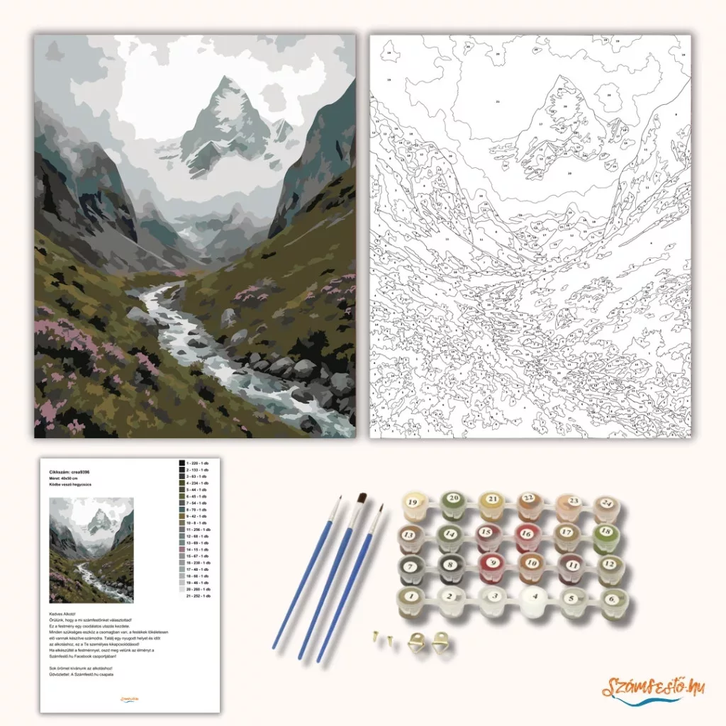 A képen egy hegyvidéki völgy látható, középen kanyargó patakkal és kövekkel szegélyezett mederrel. A távolban meredek hegycsúcs emelkedik, körülötte sűrű köd és felhők ülnek. Az előtérben hegyi rét és apró virágfoltok teszik barátságossá a hűvös, nyugodt tájat. Díszítsd otthonodat saját kézzel készített műalkotással, vagy ajándékozd meg szeretteidet egy igazán különleges élménnyel! A számfestő készletben minden szükséges eszköz megtalálható a festmény elkészítéséhez.