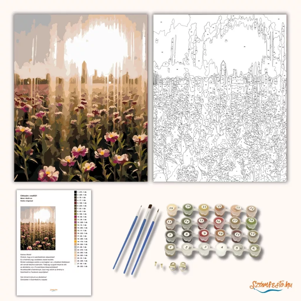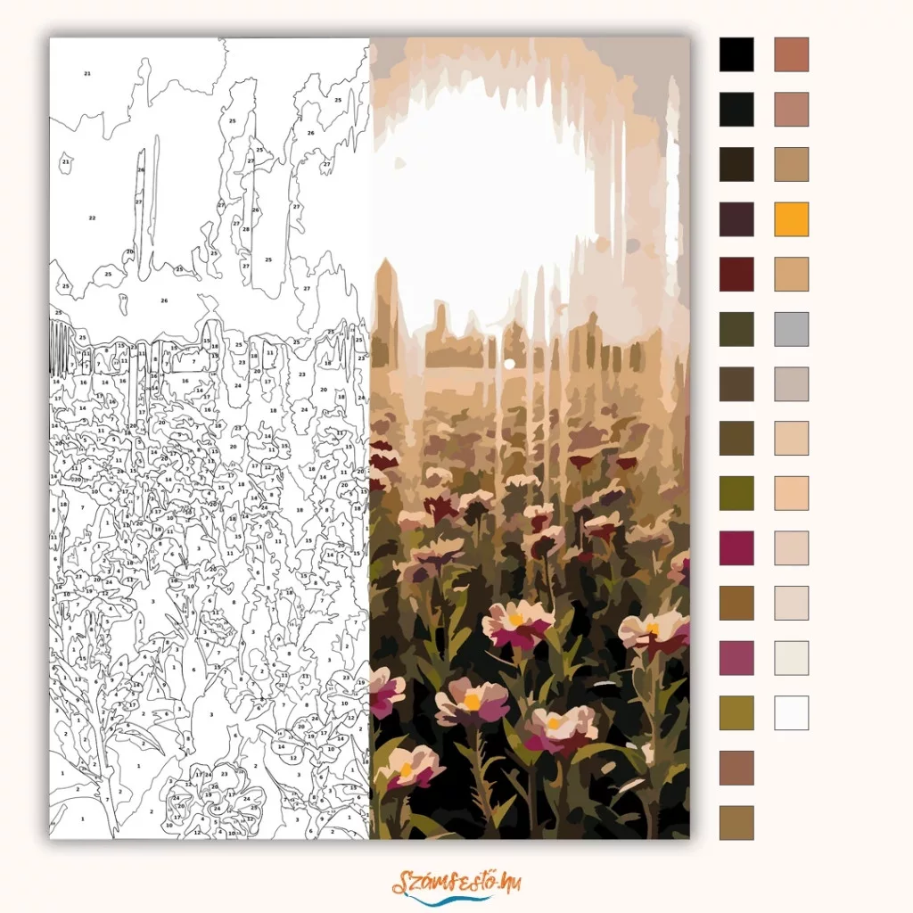 A képen egy távoli város sziluettje látható, előtte virágzó mezővel. A napfényes, ködös háttér és a sok virág nyugodt, álomszerű hangulatot ad. Meleg, lágy árnyalatok uralják a látványt, a virágok között sötétebb levelek és szárak rajzolódnak ki. Legyen a lakásod dísze vagy egy kedves meglepetés valaki számára – ez a számfestő készlet tökéletes választás mindkettőre. A készletben mindent megtalálsz, amivel lépésről lépésre megalkotható ez a gyönyörű festmény.