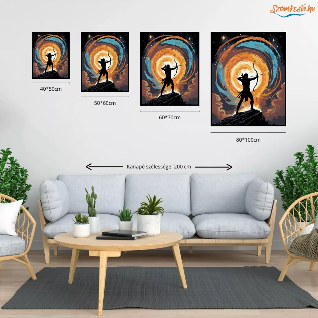 A képen egy íjász alak sziluettje látható, amint egy sziklán állva felfelé céloz. Mögötte örvénylő kozmikus égbolt ragyog, csillagokkal és fényes, tűzszerű gyűrűvel. A látvány lendületes és misztikus hangulatot áraszt. Legyen a lakásod dísze vagy egy kedves meglepetés valaki számára – ez a számfestő készlet tökéletes választás mindkettőre. A készletben mindent megtalálsz, amivel lépésről lépésre megalkotható ez a gyönyörű festmény.