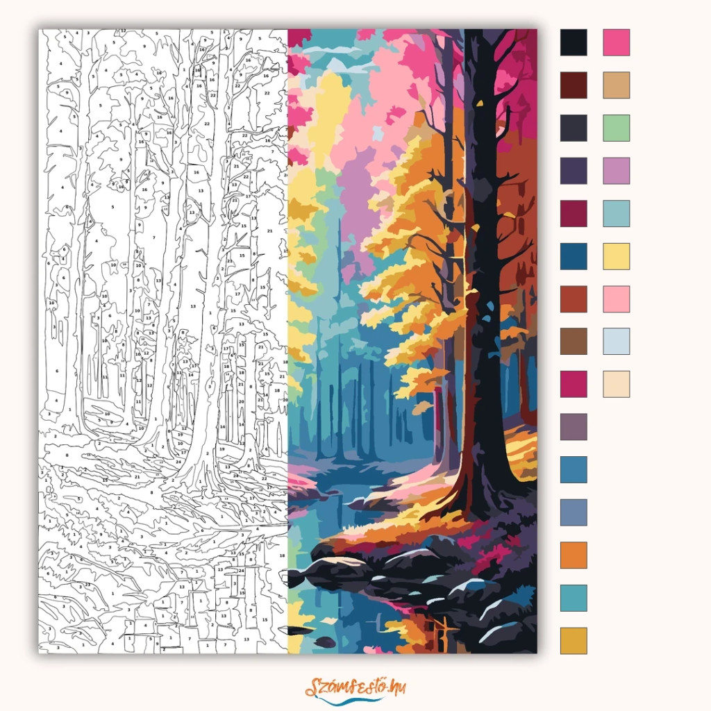 A képen egy erdei patak kanyarog magas fák között, a víz tükrében visszacsillanó, ragyogó fényekkel. A lombkorona élénk, szivárványszerű árnyalatokban játszik, amitől a táj mesés és nyugodt hangulatú. A parton kövek és erdei aljnövényzet keretezik a látványt. Legyen a lakásod dísze vagy egy kedves meglepetés valaki számára – ez a számfestő készlet tökéletes választás mindkettőre. A készletben mindent megtalálsz, amivel lépésről lépésre megalkotható ez a gyönyörű festmény.