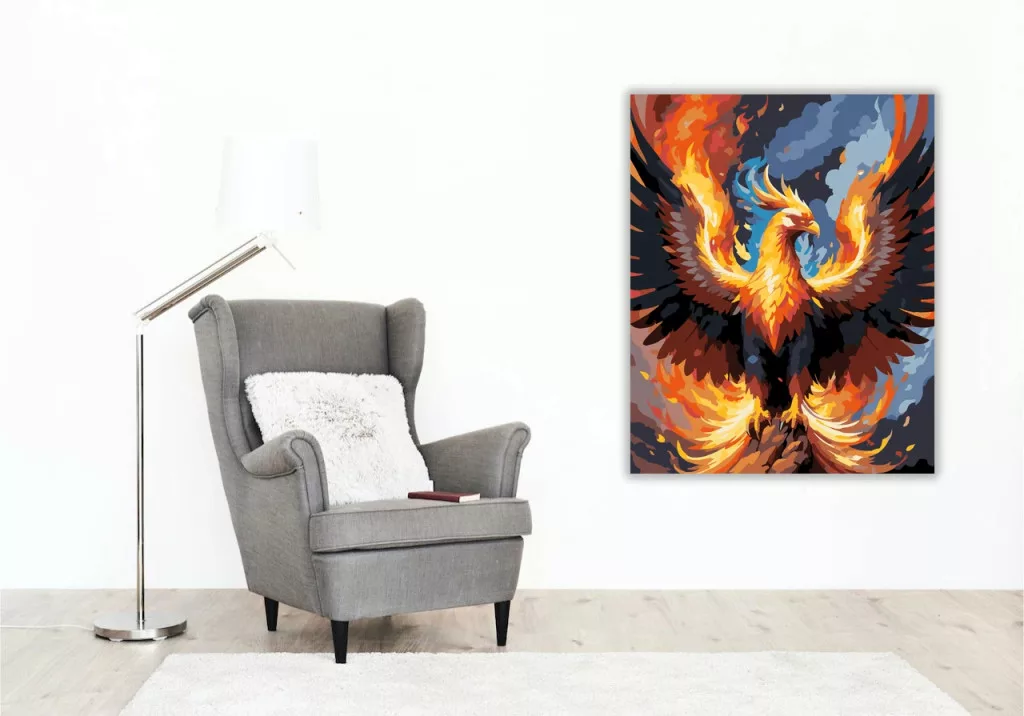 A képen egy lángoló főnix emelkedik fel, hatalmasra tárt szárnyakkal a füstös égbolt előtt. A tollazat aranyló és vöröses fényben izzik, körülötte örvénylő tűz és szálló parázs látható. Az egész jelenet erőt és drámai, tüzes hangulatot áraszt. Legyen a lakásod dísze vagy egy kedves meglepetés valaki számára – ez a számfestő készlet tökéletes választás mindkettőre. A készletben mindent megtalálsz, amivel lépésről lépésre megalkotható ez a gyönyörű festmény.