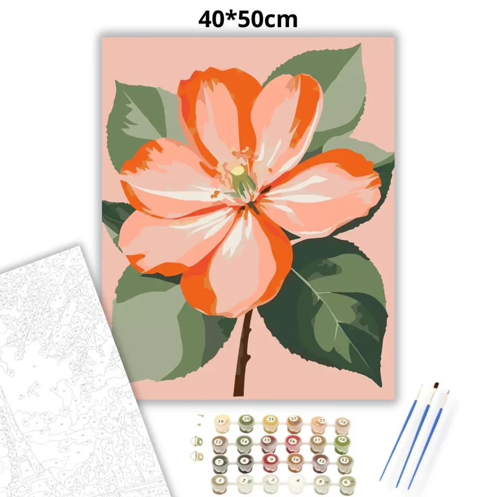 A képen egy nagy, egyszerű formájú barackvirág látható, széles szirmokkal és finom részletekkel a közepén. A virágot zöld levelek veszik körül, a háttér pedig halvány rózsaszín. Friss, derűs hangulatú kép, ami könnyen feldobja a teret. Díszítsd otthonodat saját kézzel készített műalkotással, vagy ajándékozd meg szeretteidet egy igazán különleges élménnyel! A számfestő készletben minden szükséges eszköz megtalálható a festmény elkészítéséhez.