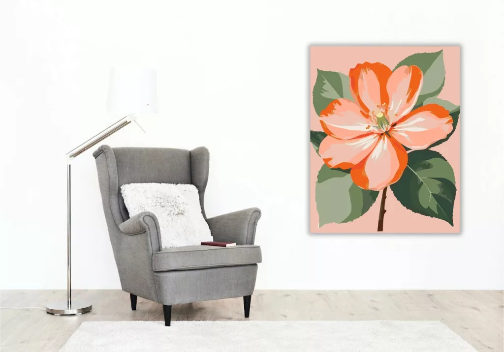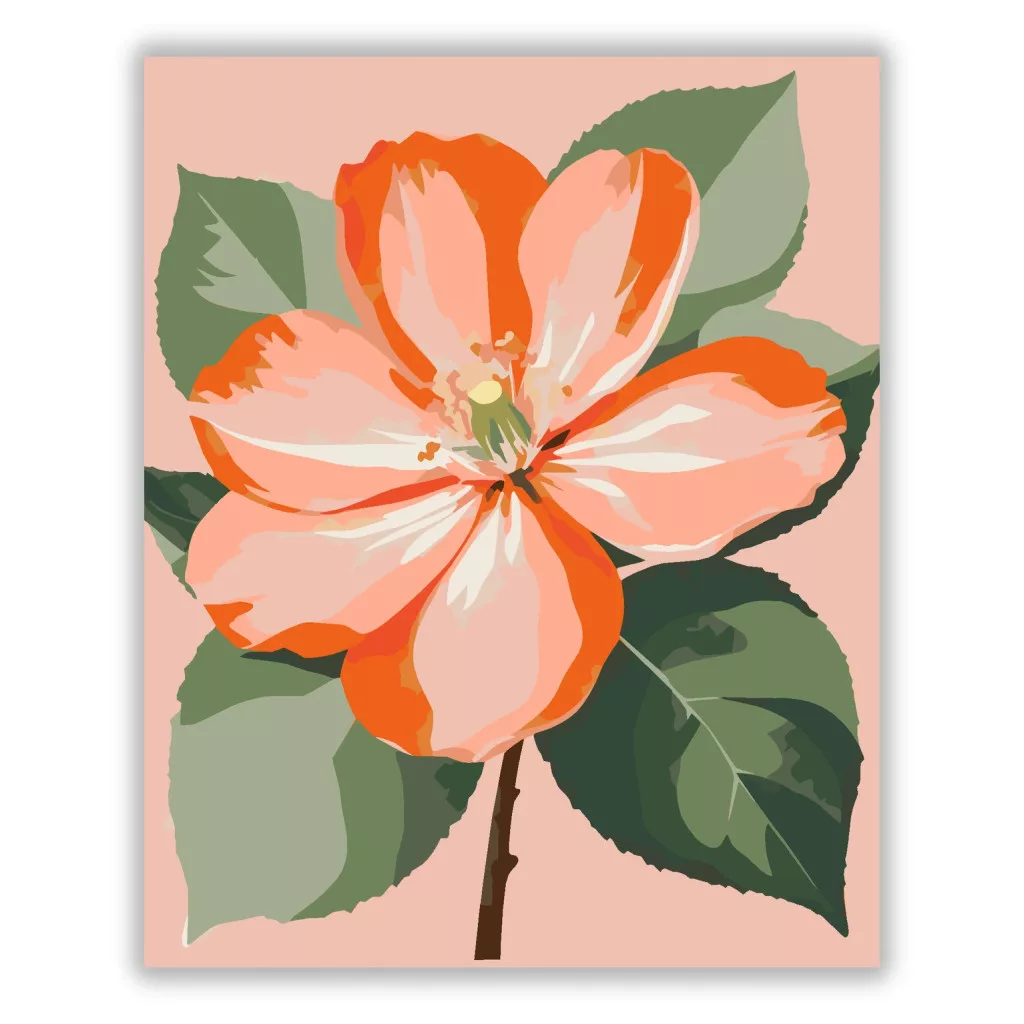 A képen egy nagy, egyszerű formájú barackvirág látható, széles szirmokkal és finom részletekkel a közepén. A virágot zöld levelek veszik körül, a háttér pedig halvány rózsaszín. Friss, derűs hangulatú kép, ami könnyen feldobja a teret. Díszítsd otthonodat saját kézzel készített műalkotással, vagy ajándékozd meg szeretteidet egy igazán különleges élménnyel! A számfestő készletben minden szükséges eszköz megtalálható a festmény elkészítéséhez.
