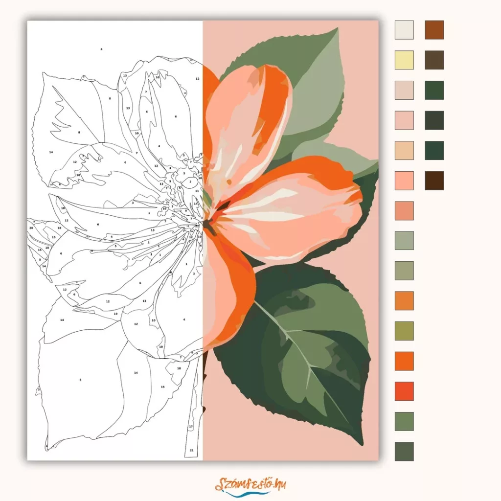 A képen egy nagy, egyszerű formájú barackvirág látható, széles szirmokkal és finom részletekkel a közepén. A virágot zöld levelek veszik körül, a háttér pedig halvány rózsaszín. Friss, derűs hangulatú kép, ami könnyen feldobja a teret. Varázsolj egyedi hangulatot otthonodba ezzel a gyönyörű számfestő készlettel, amely tökéletes ajándék is lehet szeretteid számára. A csomag mindent tartalmaz, amire szükséged van ahhoz, hogy saját kezűleg alkoss egy lenyűgöző festményt.