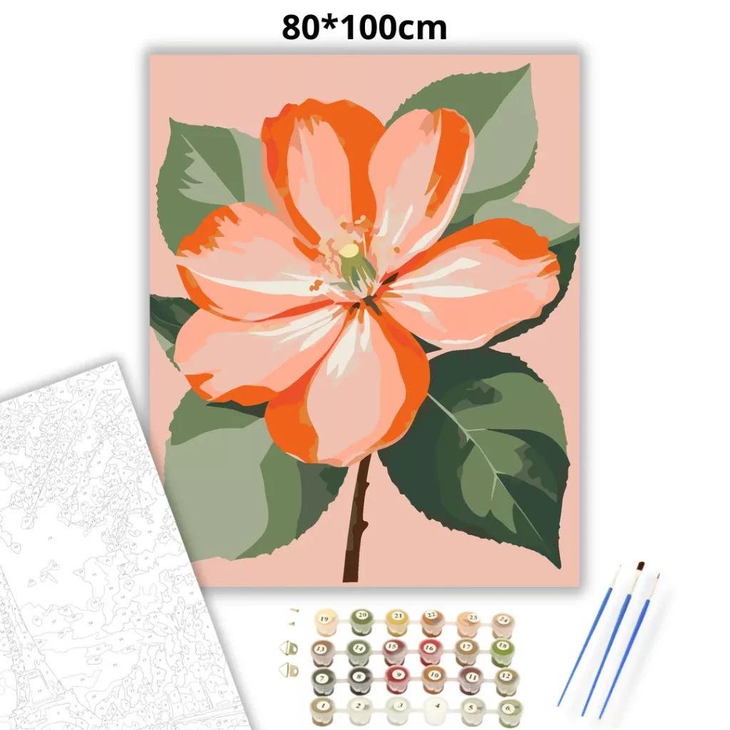 A képen egy nagy, egyszerű formájú barackvirág látható, széles szirmokkal és finom részletekkel a közepén. A virágot zöld levelek veszik körül, a háttér pedig halvány rózsaszín. Friss, derűs hangulatú kép, ami könnyen feldobja a teret. Díszítsd otthonodat saját kézzel készített műalkotással, vagy ajándékozd meg szeretteidet egy igazán különleges élménnyel! A számfestő készletben minden szükséges eszköz megtalálható a festmény elkészítéséhez.