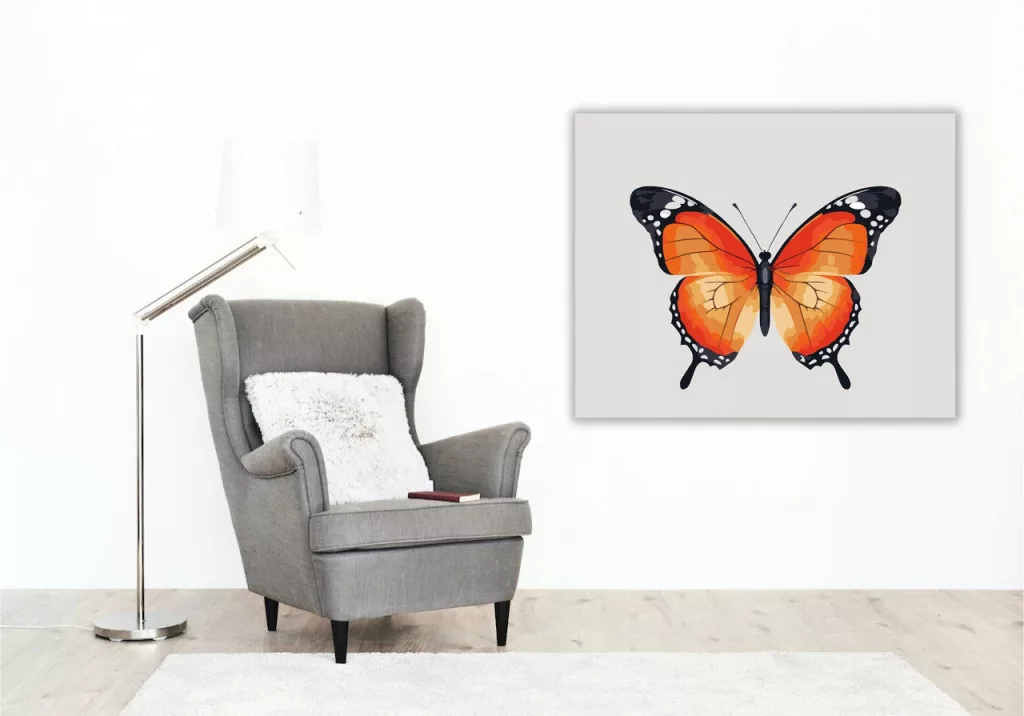 A képen egy narancsos-vörös szárnyú pillangó látható világos háttéren, fekete szegéllyel és fehér pöttyökkel. A szárnyakon finom átmenetek és erezet rajzolódik ki. Letisztult, friss hangulatú kép, ami jól mutat modern és természetközeli terekben is. Varázsolj egyedi hangulatot otthonodba ezzel a gyönyörű számfestő készlettel, amely tökéletes ajándék is lehet szeretteid számára. A csomag mindent tartalmaz, amire szükséged van ahhoz, hogy saját kezűleg alkoss egy lenyűgöző festményt.