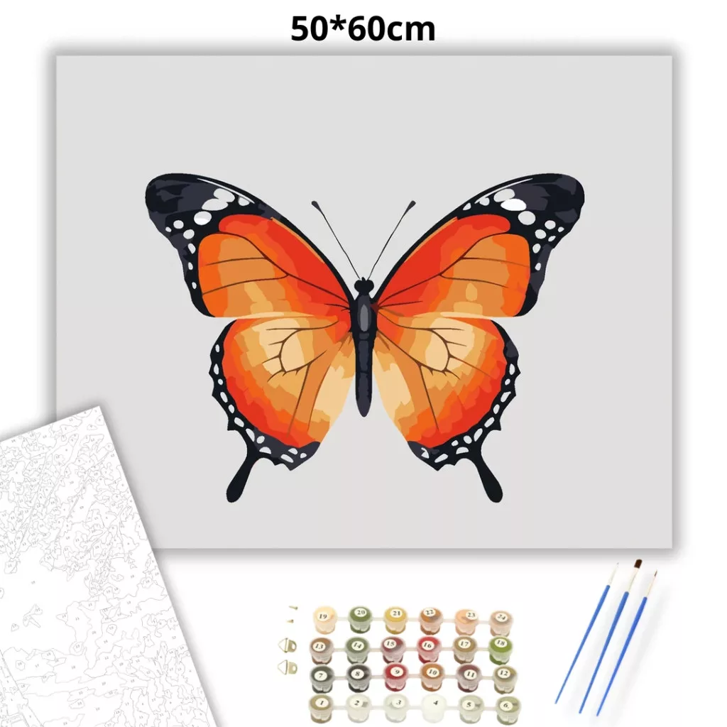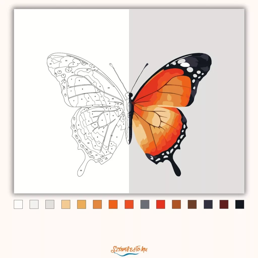 A képen egy narancsos-vörös szárnyú pillangó látható világos háttéren, fekete szegéllyel és fehér pöttyökkel. A szárnyakon finom átmenetek és erezet rajzolódik ki. Letisztult, friss hangulatú kép, ami jól mutat modern és természetközeli terekben is. Ez a számfestő készlet tökéletes választás, ha egyedi dekorációval tennéd szebbé otthonodat, vagy ha különleges ajándékot keresel. A csomagban minden megtalálható, amire a festéshez szükséged van.