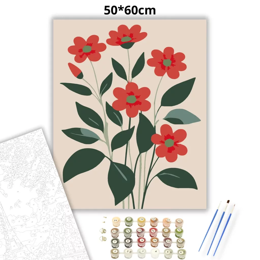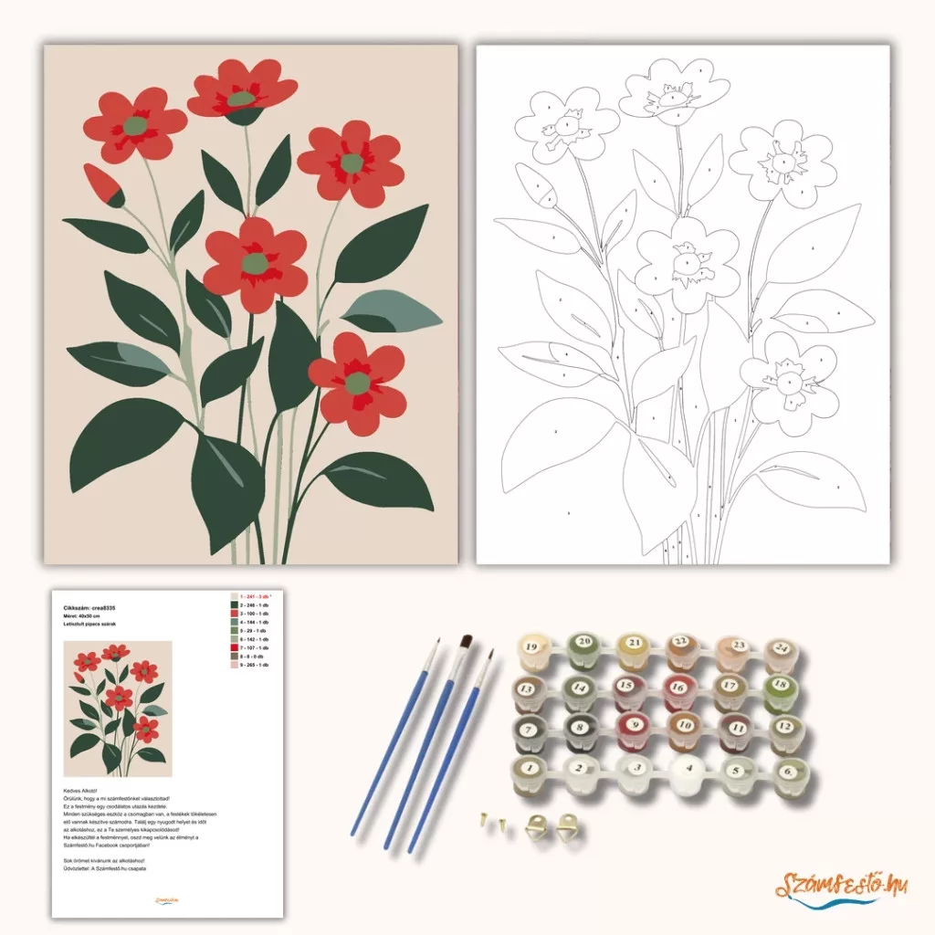 A képen öt lapos, piros virág látható sötétzöld levelekkel és vékony szárakkal, krémszínű háttér előtt. A letisztult formák friss, vidám hangulatot adnak. Kellemes választás, ha egyszerű, természetközeli virágos képet keresel a falra. Engedd szabadjára a kreativitásodat, és alkoss egy különleges műalkotást, amely otthonod dísze lehet de egyedi ajándékként is kiváló. A számfestő készletben minden szükséges eszközt megtalálsz a tökéletes végeredményhez.