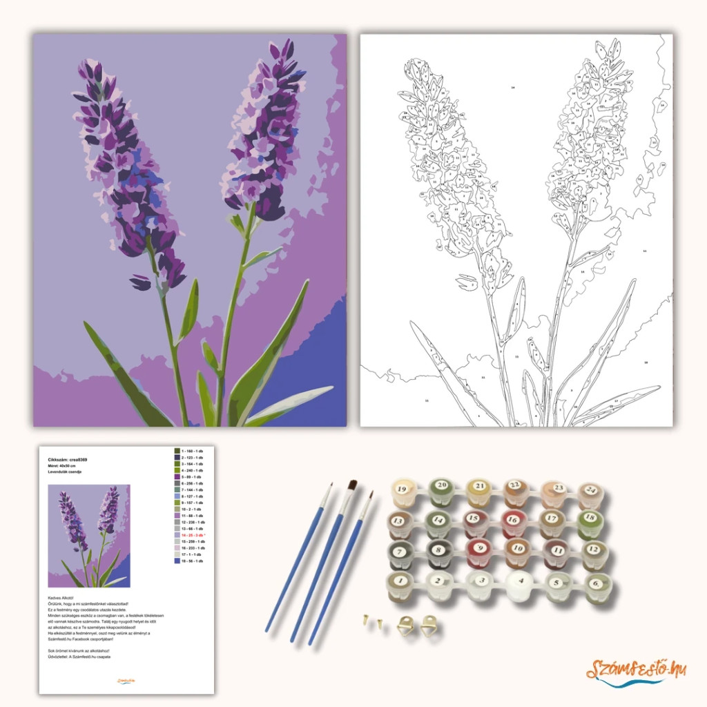 A képen két levendulaszár látható, apró virágfürtökkel és karcsú zöld levelekkel. A lila és ibolya árnyalatok nyugodt, lágy hangulatot adnak a képnek. Letisztult, virágos dísz, ami frissességet visz a falra. Engedd szabadjára a kreativitásodat, és alkoss egy különleges műalkotást, amely otthonod dísze lehet de egyedi ajándékként is kiváló. A számfestő készletben minden szükséges eszközt megtalálsz a tökéletes végeredményhez.