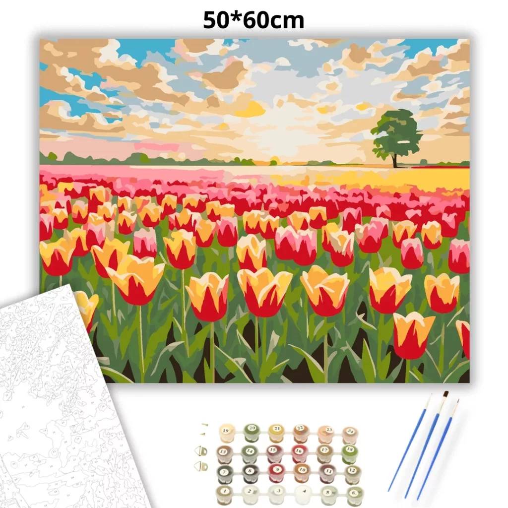 A képen egy tavaszi tulipánmező látható, amely szinte a látóhatárig nyúlik. A virágok piros, rózsaszín és sárga árnyalatai vidám, friss hangulatot adnak. Fent pasztelles napfelkelte és felhős ég, a távolban pedig egy magányos fa zárja a tájat. Legyen a lakásod dísze vagy egy kedves meglepetés valaki számára – ez a számfestő készlet tökéletes választás mindkettőre. A készletben mindent megtalálsz, amivel lépésről lépésre megalkotható ez a gyönyörű festmény.