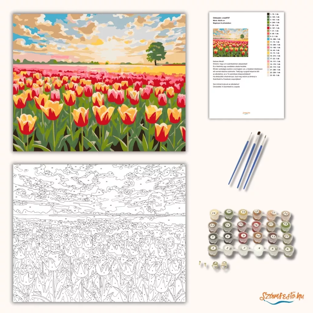 A képen egy tavaszi tulipánmező látható, amely szinte a látóhatárig nyúlik. A virágok piros, rózsaszín és sárga árnyalatai vidám, friss hangulatot adnak. Fent pasztelles napfelkelte és felhős ég, a távolban pedig egy magányos fa zárja a tájat. Engedd szabadjára a kreativitásodat, és alkoss egy különleges műalkotást, amely otthonod dísze lehet de egyedi ajándékként is kiváló. A számfestő készletben minden szükséges eszközt megtalálsz a tökéletes végeredményhez.