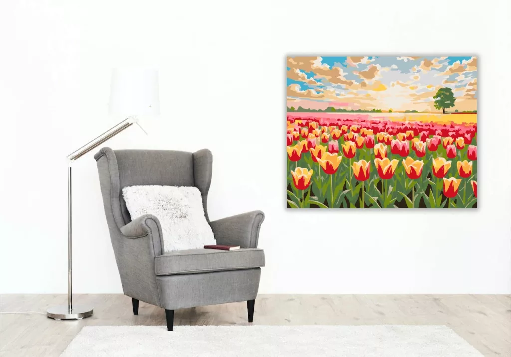A képen egy tavaszi tulipánmező látható, amely szinte a látóhatárig nyúlik. A virágok piros, rózsaszín és sárga árnyalatai vidám, friss hangulatot adnak. Fent pasztelles napfelkelte és felhős ég, a távolban pedig egy magányos fa zárja a tájat. Engedd szabadjára a kreativitásodat, és alkoss egy különleges műalkotást, amely otthonod dísze lehet de egyedi ajándékként is kiváló. A számfestő készletben minden szükséges eszközt megtalálsz a tökéletes végeredményhez.