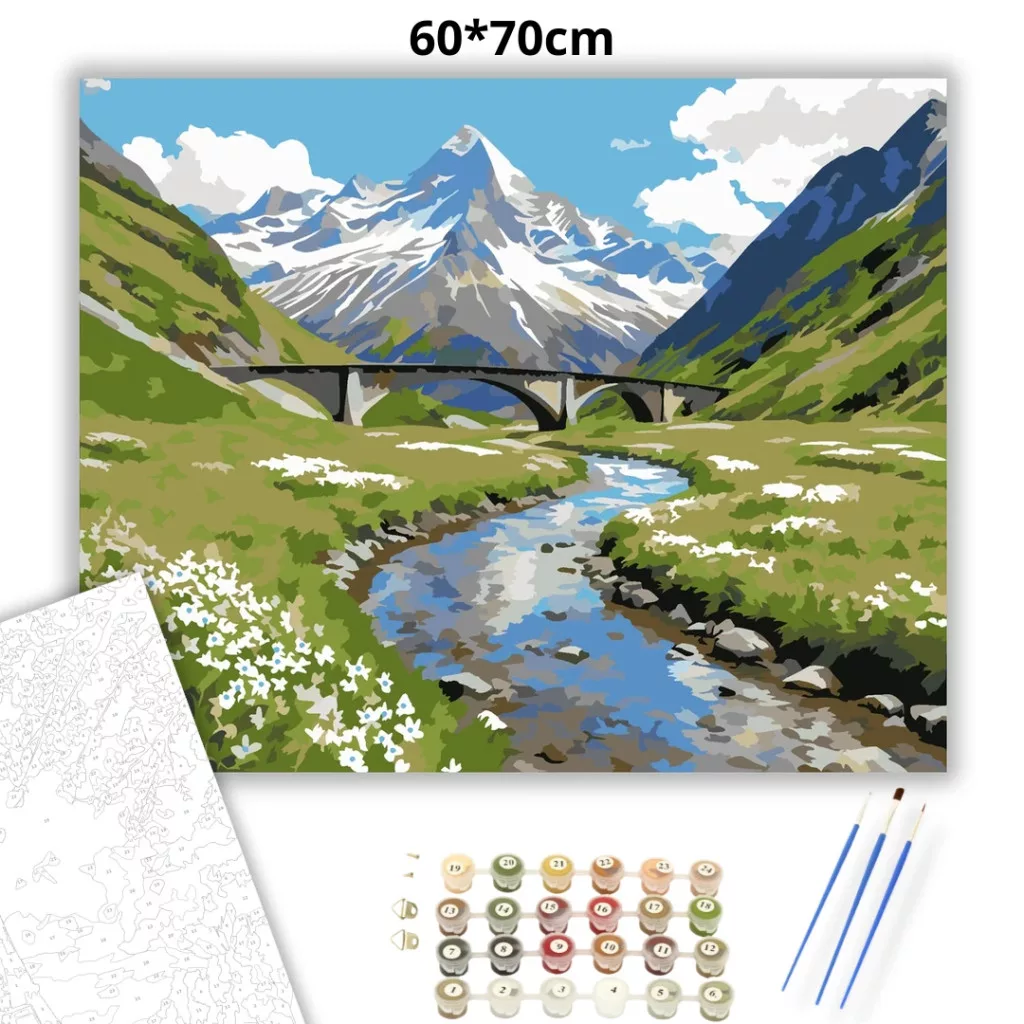 A képen egy kanyargó folyó fut végig egy hegyi völgyön, a háttérben hófödte csúcsokkal. A zöld lejtők között egy íves híd ível át, a parton kövekkel és apró fehér virágokkal. Friss, tiszta hangulatú tájkép, sok égbolttal és felhőkkel. Legyen a lakásod dísze vagy egy kedves meglepetés valaki számára – ez a számfestő készlet tökéletes választás mindkettőre. A készletben mindent megtalálsz, amivel lépésről lépésre megalkotható ez a gyönyörű festmény.