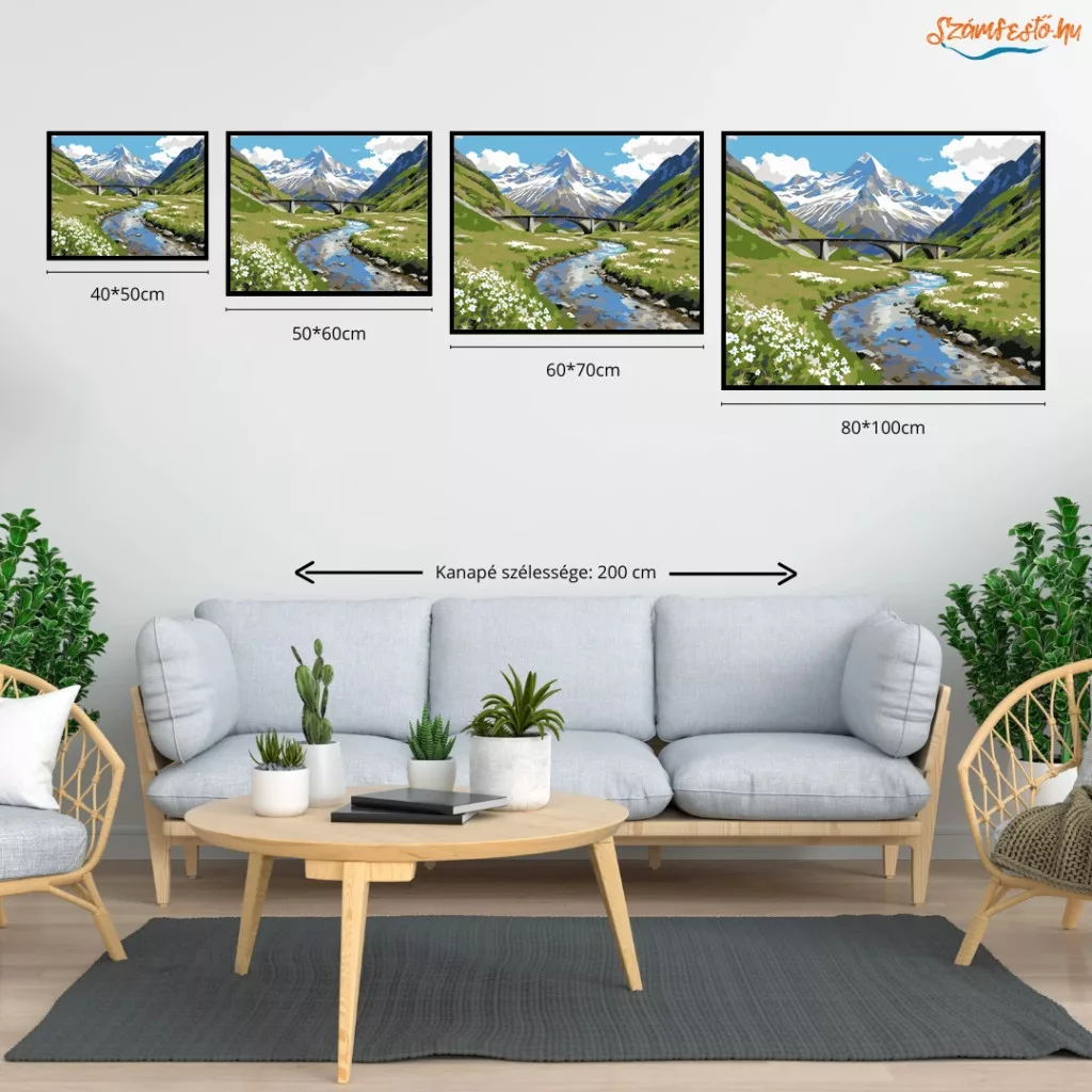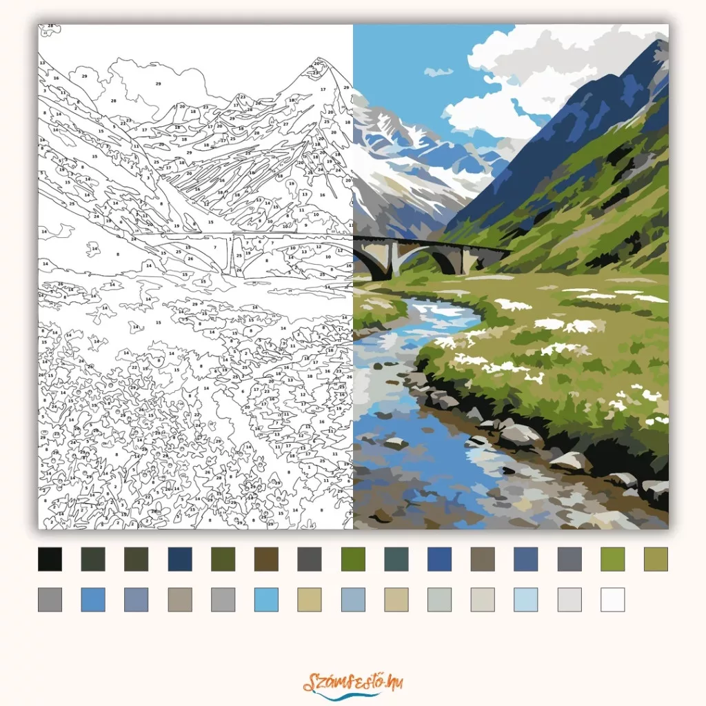 A képen egy kanyargó folyó fut végig egy hegyi völgyön, a háttérben hófödte csúcsokkal. A zöld lejtők között egy íves híd ível át, a parton kövekkel és apró fehér virágokkal. Friss, tiszta hangulatú tájkép, sok égbolttal és felhőkkel. Varázsolj egyedi hangulatot otthonodba ezzel a gyönyörű számfestő készlettel, amely tökéletes ajándék is lehet szeretteid számára. A csomag mindent tartalmaz, amire szükséged van ahhoz, hogy saját kezűleg alkoss egy lenyűgöző festményt.