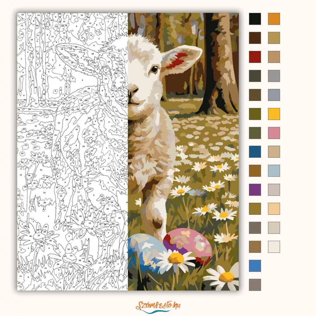 A képen egy fiatal bárány áll egy virágos réten, körülötte margarétákkal. A háttérben fák látszanak, az összhatás nyugodt, tavaszias hangulatot áraszt. Az előtérben két színes húsvéti tojás teszi még kedvesebbé a jelenetet. Varázsolj egyedi hangulatot otthonodba ezzel a gyönyörű számfestő készlettel, amely tökéletes ajándék is lehet szeretteid számára. A csomag mindent tartalmaz, amire szükséged van ahhoz, hogy saját kezűleg alkoss egy lenyűgöző festményt.