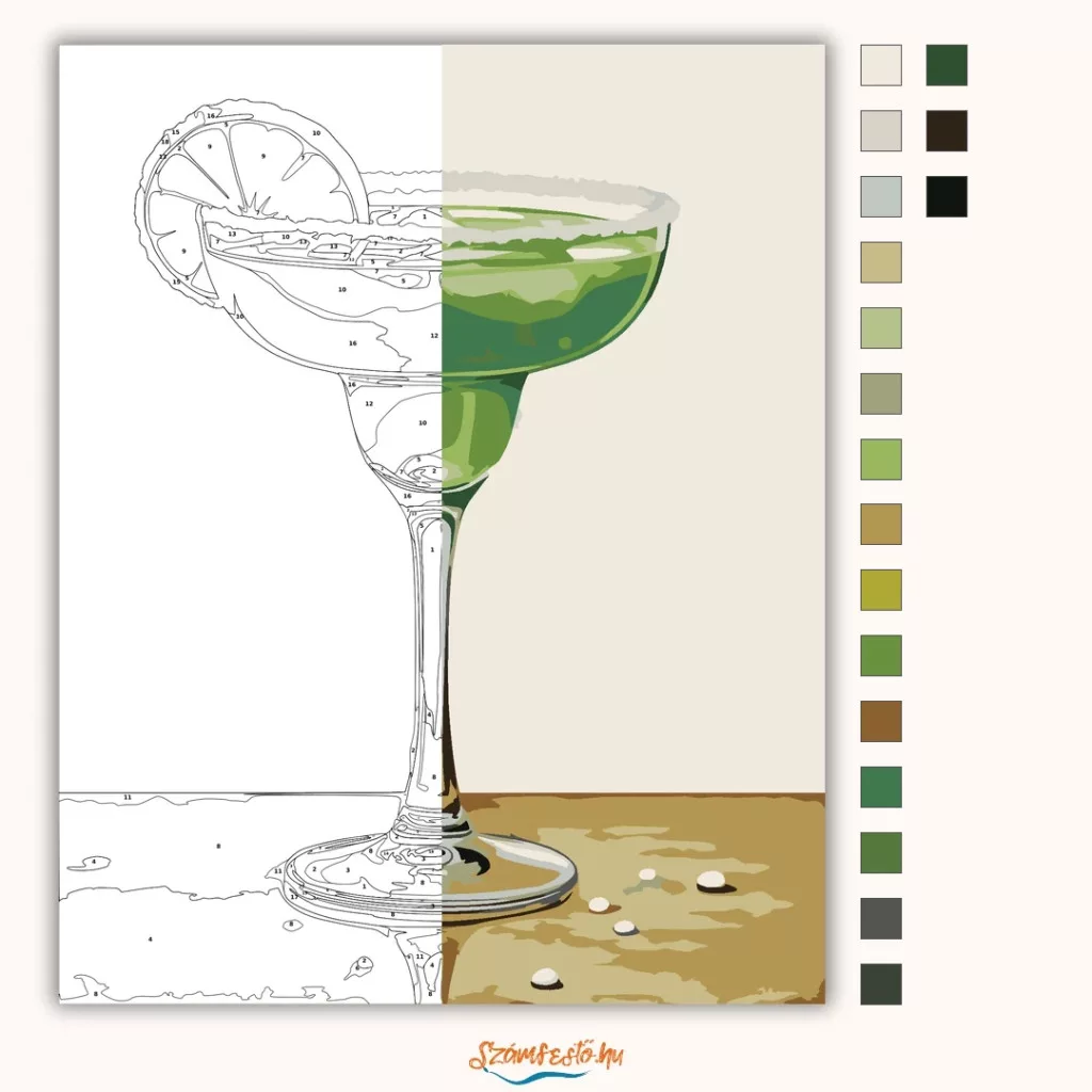 A képen egy Margarita koktél látható széles talpas pohárban, a peremén sóval és egy lime szelettel díszítve. A merész zöld árnyalatok friss, nyári hangulatot adnak. A kopottas bézs háttér és az asztalon szóródó só szemcséi retró, laza összképet teremtenek. Legyen a lakásod dísze vagy egy kedves meglepetés valaki számára – ez a számfestő készlet tökéletes választás mindkettőre. A készletben mindent megtalálsz, amivel lépésről lépésre megalkotható ez a gyönyörű festmény.