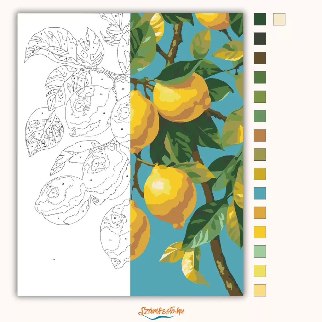 A képen érett citromok lógnak egy ágon, fényes levelek között. A türkiz háttér kiemeli a gyümölcsök friss, napfényes hangulatát. Vidám, üde látvány, ami azonnal mediterrán érzést kelt. Ez a számfestő készlet tökéletes választás, ha egyedi dekorációval tennéd szebbé otthonodat, vagy ha különleges ajándékot keresel. A csomagban minden megtalálható, amire a festéshez szükséged van.