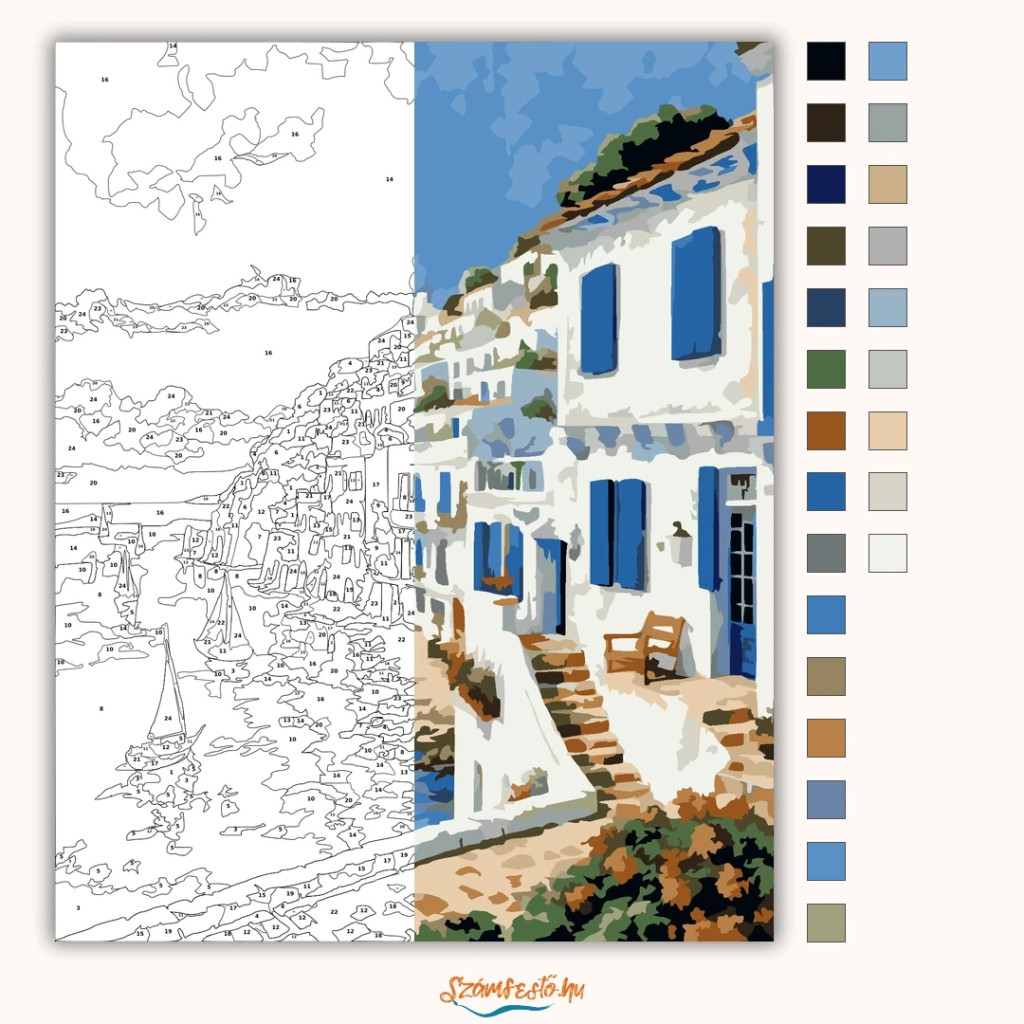 A képen fehérre meszelt tengerparti házak sorakoznak kék zsalugáterekkel, közvetlenül a sziklás part fölött. A nyugodt, csillogó tengeren több vitorlás hajó látható, a háttérben felhős égbolttal. Friss, mediterrán hangulatú látvány, amely a nyaralás nyugalmát idézi. Engedd szabadjára a kreativitásodat, és alkoss egy különleges műalkotást, amely otthonod dísze lehet de egyedi ajándékként is kiváló. A számfestő készletben minden szükséges eszközt megtalálsz a tökéletes végeredményhez.