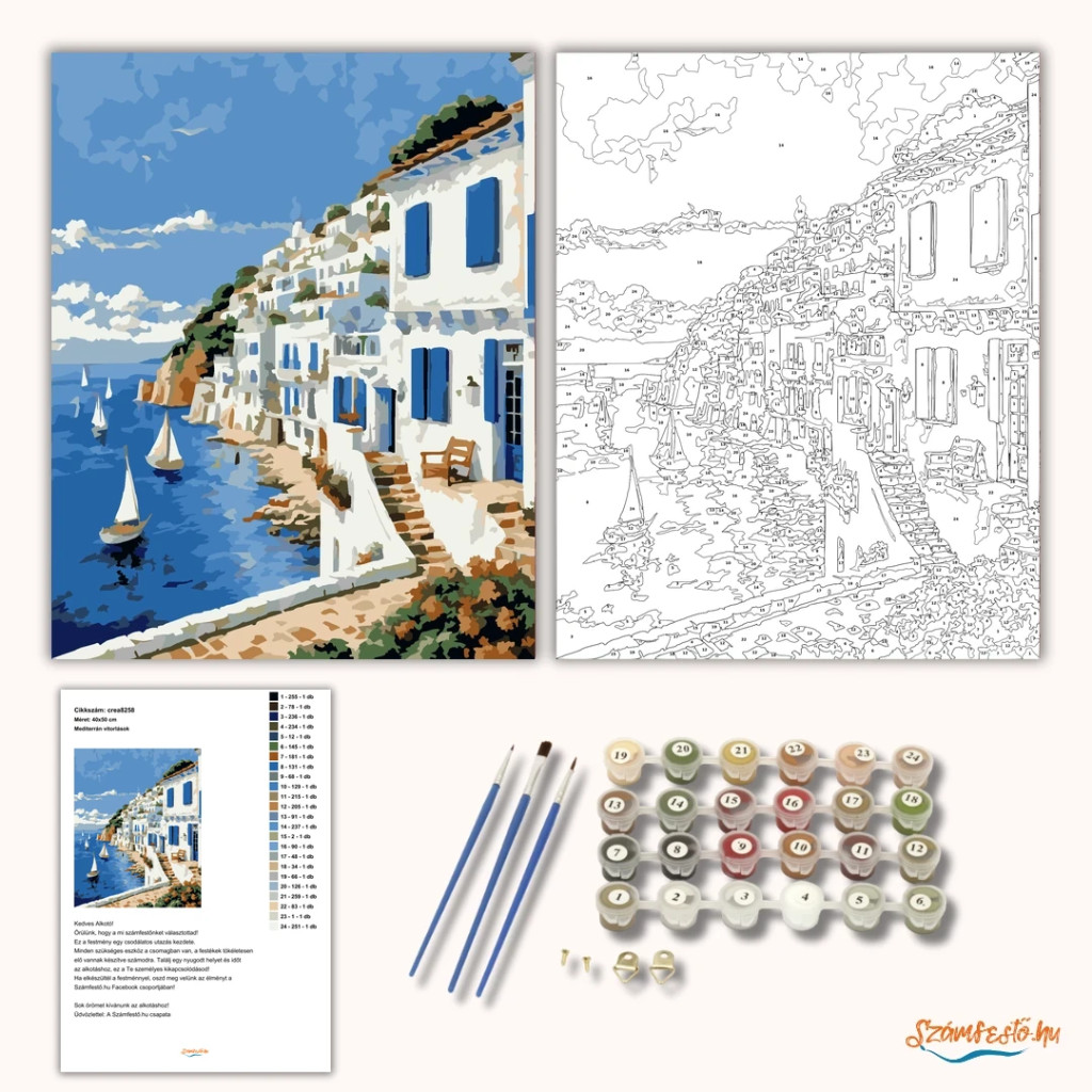 A képen fehérre meszelt tengerparti házak sorakoznak kék zsalugáterekkel, közvetlenül a sziklás part fölött. A nyugodt, csillogó tengeren több vitorlás hajó látható, a háttérben felhős égbolttal. Friss, mediterrán hangulatú látvány, amely a nyaralás nyugalmát idézi. Legyen a lakásod dísze vagy egy kedves meglepetés valaki számára – ez a számfestő készlet tökéletes választás mindkettőre. A készletben mindent megtalálsz, amivel lépésről lépésre megalkotható ez a gyönyörű festmény.