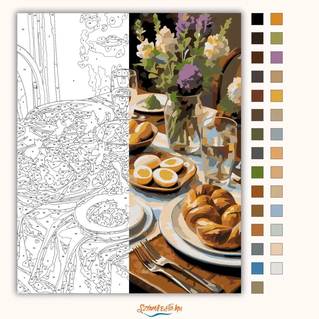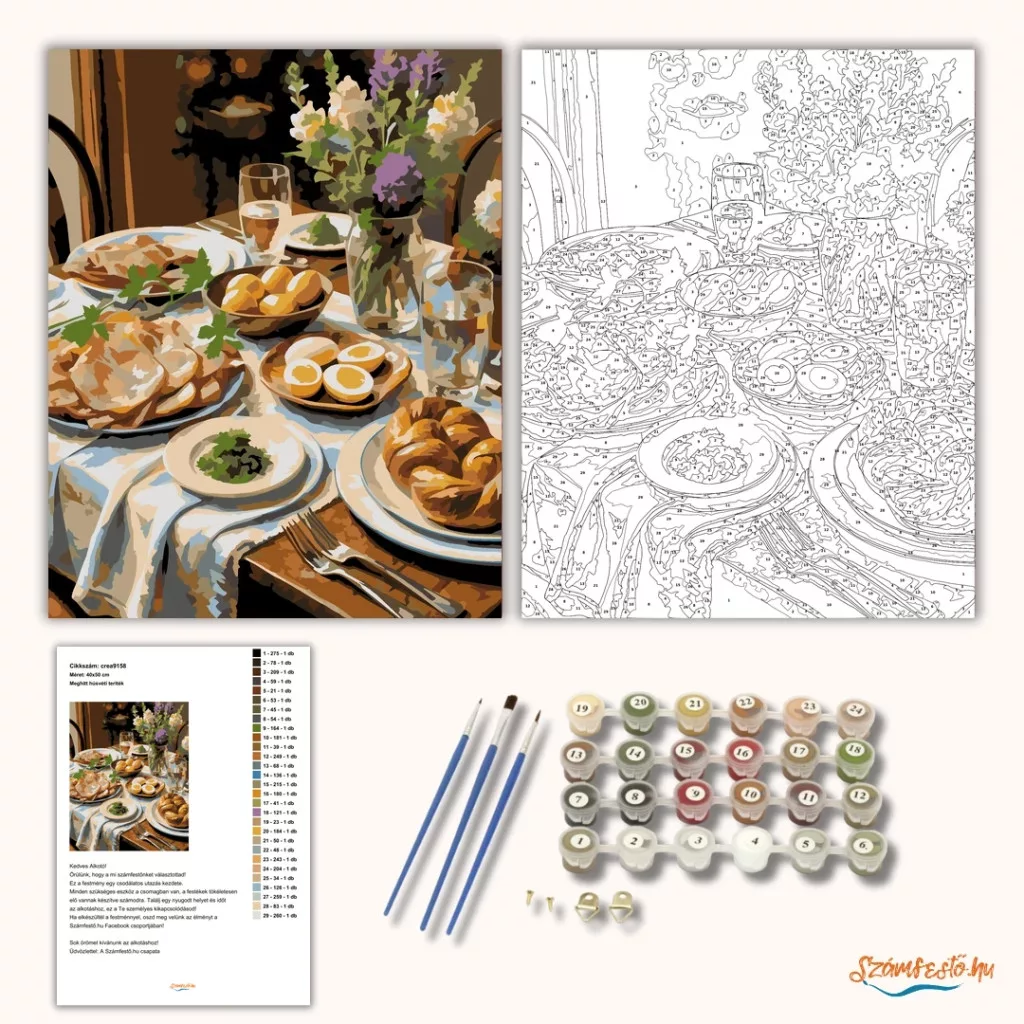 A képen egy hagyományos húsvéti asztal látható: fonott kalács, főtt tojás és több tál étel sorakozik a fehér abroszon. A vázában tavaszi virágcsokor áll, mellette poharak és tányérok teszik ünnepivé a terítéket. A meleg, otthonos hangulatot a barnás-arany tónusok és a lágy fények erősítik. Legyen a lakásod dísze vagy egy kedves meglepetés valaki számára – ez a számfestő készlet tökéletes választás mindkettőre. A készletben mindent megtalálsz, amivel lépésről lépésre megalkotható ez a gyönyörű festmény.