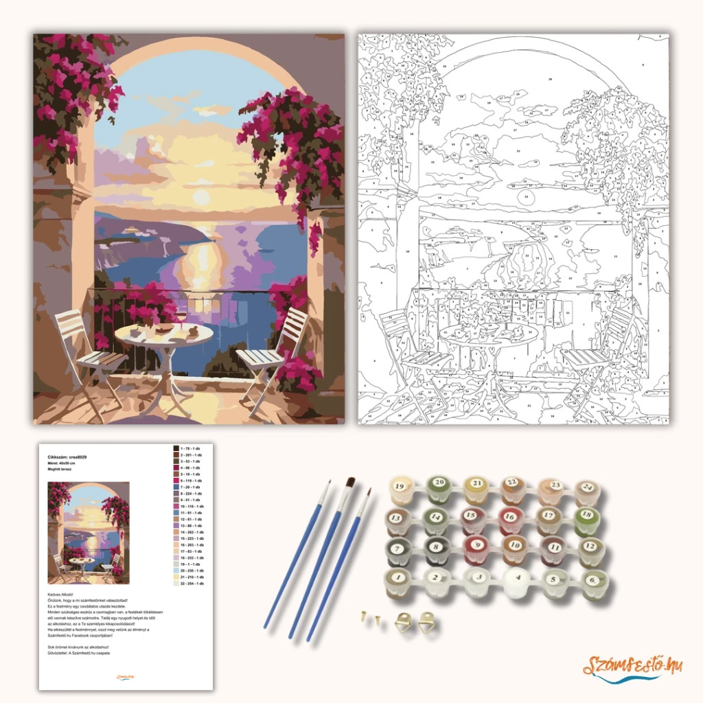 Egy boltíves terasz látható, ahonnan a tengerre és a naplementére nyílik kilátás. A korláton és a boltív mellett élénk virágok futnak, a fény pedig a víz felszínén tükröződik. Elöl egy kerek asztal, két szék és egy pohár teszi meghitté a jelenetet. Ez a számfestő készlet tökéletes választás, ha egyedi dekorációval tennéd szebbé otthonodat, vagy ha különleges ajándékot keresel. A csomagban minden megtalálható, amire a festéshez szükséged van.