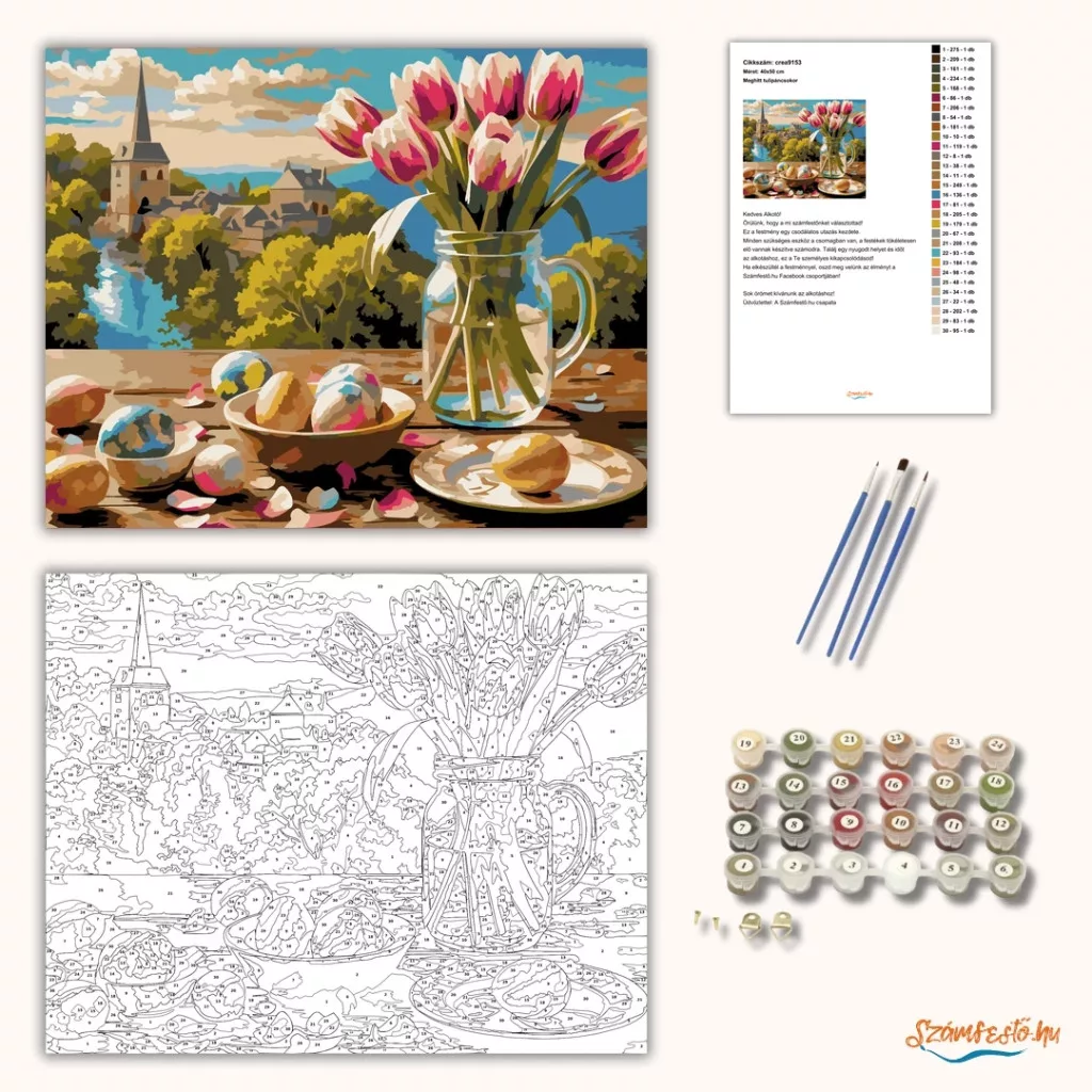 Egy rusztikus faasztalon tulipáncsokor áll egy üvegkancsóban, mellette festett tojások látható, szirmokkal elszórva. A háttérben folyóparti táj bontakozik ki fák között, egy templomtoronnyal és háztetőkkel. A napfényes ég és a tavaszi hangulat nyugodt, otthonos érzést ad a képnek. Díszítsd otthonodat saját kézzel készített műalkotással, vagy ajándékozd meg szeretteidet egy igazán különleges élménnyel! A számfestő készletben minden szükséges eszköz megtalálható a festmény elkészítéséhez.